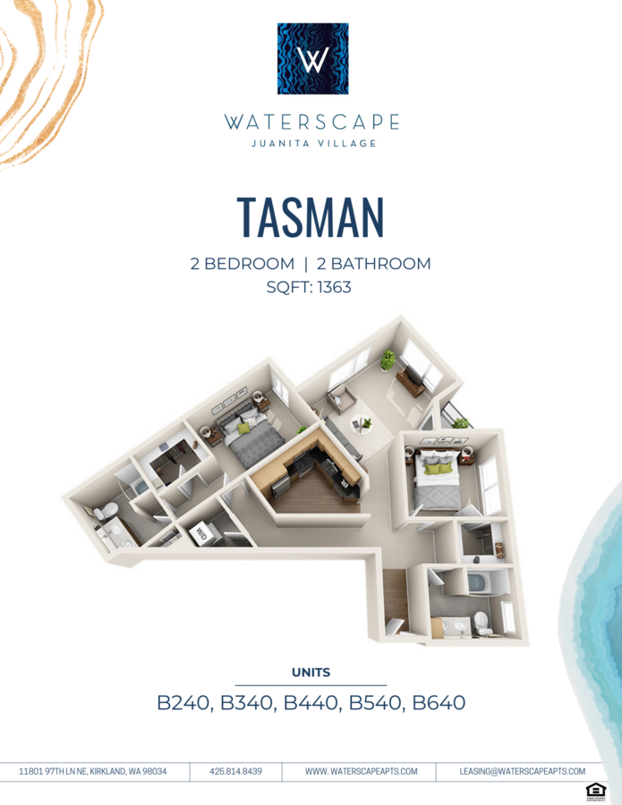 Welcome to Waterscape at Juanita Village, a vibrant lakeside community nestled in the heart of Kirkland. These thoughtfully designed apartment homes offer the perfect blend of comfort, convenience, and urban charm, with stunning views of Lake Washington. Each residence features spacious layouts, upscale finishes, and private patios or balconies- ideal for enjoying the serene surroundings. With waterfront trails, local cafés, boutique shopping, and entertainment options just blocks away, Waterscape delivers a modern living experience in one of the area’s most sought-after neighborhoods.