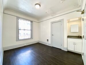 1010 Bush St., #128 is a cozy and comfortable furnished room that comes with all the essentials for the on the go person: a queen-size mattress with modern frame, nightstand, desk, chair, TV and mini refrigerator. There is also a vanity with sink, and a closet that provides storage space.