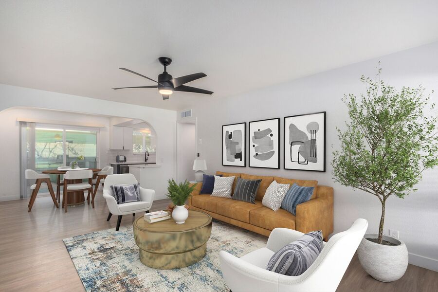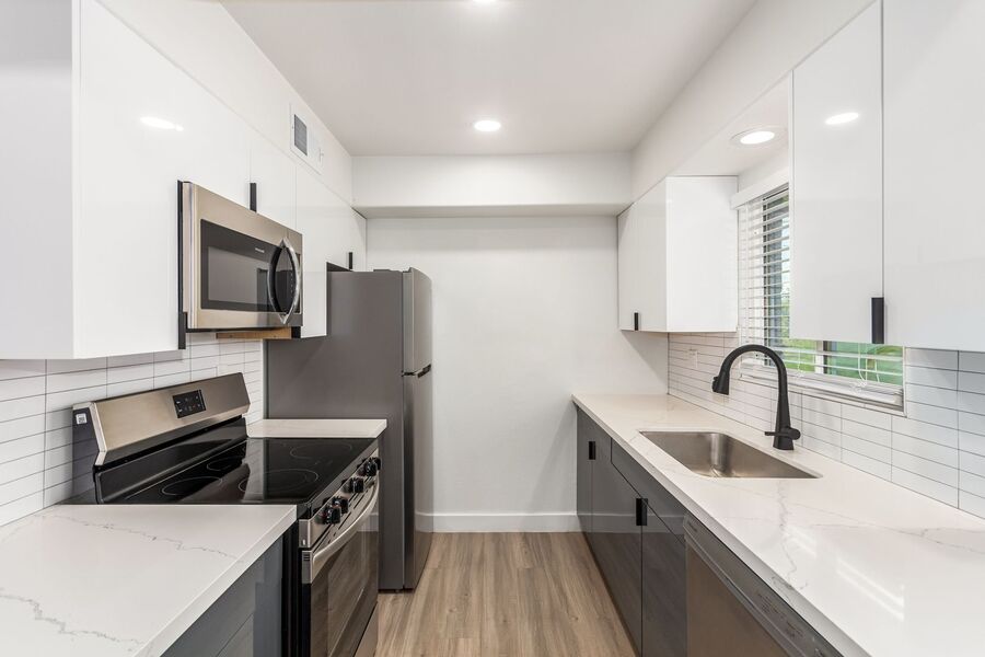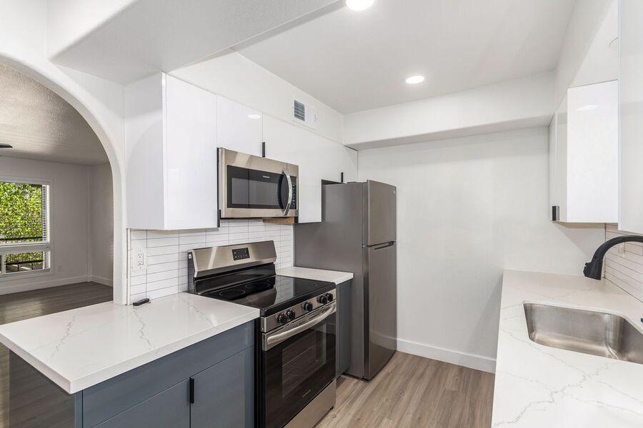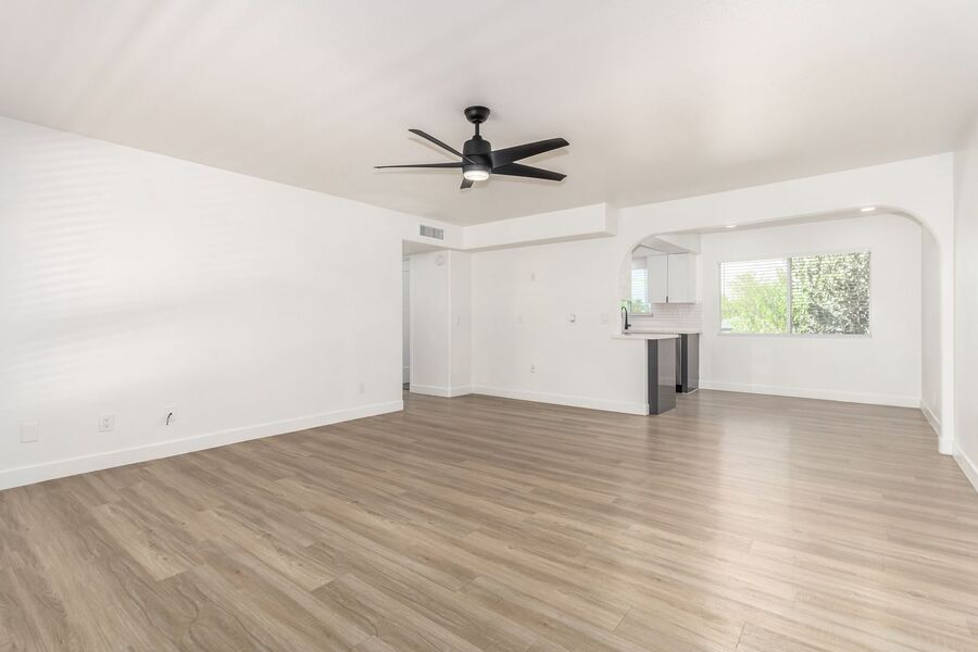 Our modern apartments offer a range of desirable features, including spacious open floor plans, open kitchens with subway backsplashes, and contemporary high gloss, full overlay, two-tone cabinetry. They come equipped with all new stainless-steel appliances, central heating, and air conditioning, as well as ceiling fans for added comfort. Residents will appreciate the convenience of a full-size stackable washer/dryer, beautiful wood grain plank flooring, and white granite countertops. The kitchens also feature pull-down gooseneck faucets and undermount deep well sinks. Additionally, each apartment includes a big private patio for outdoor enjoyment. Ideally situated just a few blocks from shopping, transportation, schools, community parks, dining, and entertainment options such as Biltmore Fashion Park and Esplanade, our location offers easy access to downtown Phoenix, Tempe, and Scottsdale, all just a 10-minute drive away. Plus, with nearby access to major highways including I-10, SR51, SR143, and Loop 202, reaching your desired destinations is a breeze.
