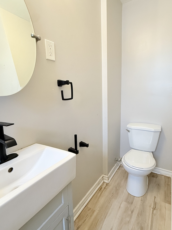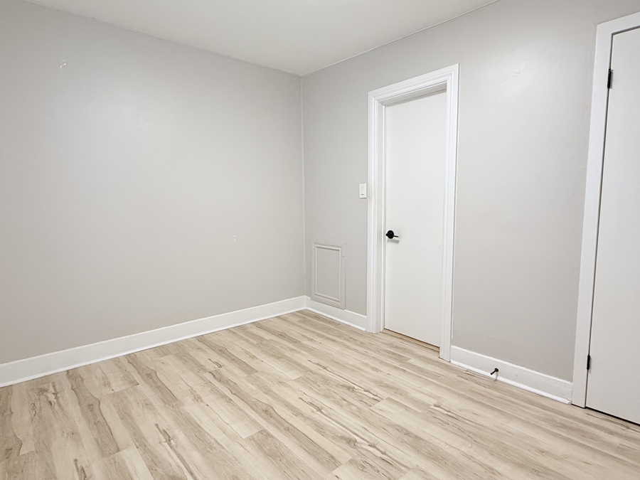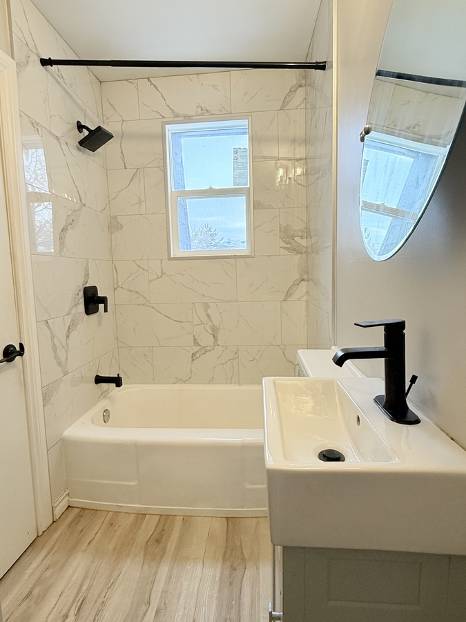 The apartment features a bright and spacious living room with fresh paint, luxury vinyl plank flooring, and modern black fixtures throughout. The bathroom includes a new tub, vanity, and toilet, creating a warm and modern feel. The bedroom is comfortably sized and filled with natural light.
