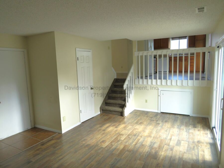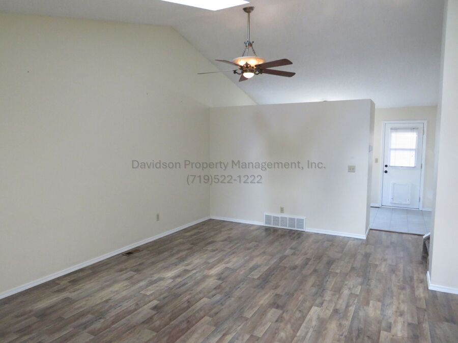 Welcome to this charming 3 bedroom tri-level home conveniently located near Fort Carson, offering comfort, space, and functionality. As you step inside, you are welcomed by a bright and spacious living room featuring vaulted ceilings and skylights that fill the space with natural light. The living room flows seamlessly into the kitchen and eat-in dining area, creating an open and inviting layout perfect for everyday living. Upstairs, you will find all three generously sized bedrooms, including the relaxing primary suite. The primary bedroom offers a large walk-in closet and a private en suite bathroom, providing a peaceful retreat. A full hall bathroom and a conveniently located laundry room complete the upper level, adding ease and practicality to daily routines. Heading down from the main level, you will discover an expansive family room centered around a cozy wood-burning fireplace, perfect for relaxing on chilly winter evenings. A convenient half bathroom is also located on this level. Step outside from either the eat-in area or the family room to enjoy the fully fenced backyard, featuring a well sized deck ideal for grilling, entertaining, or simply enjoying the outdoors. The yard offers plenty of room for play or relaxation. The home also includes a 2 car garage and a storage shed in the backyard, providing ample space for storage and convenience. This lovely 3 bedroom 2.5 bathroom home combines comfort, functionality, and a great location, and is ready to be called your home.
