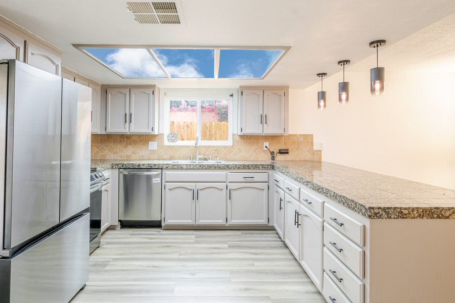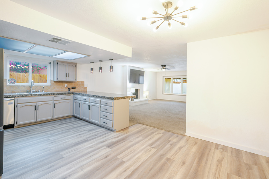 - Gorgeous newly renovated kitchen and bathrooms: luxury vinyl plank flooring in the kitchen, new fans, lights, fixtures, knobs & hinges throughout.