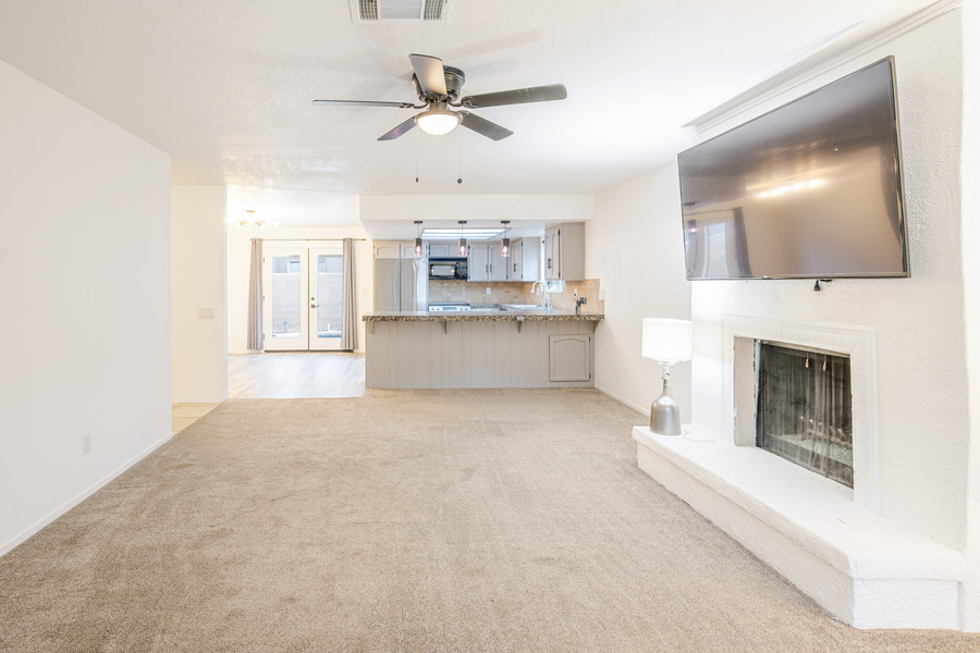 Living room includes a working fireplace and a built-in mount for a large TV above the mantel — perfect for relaxing evenings.