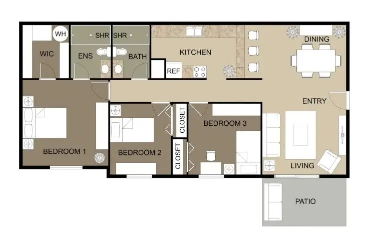 The 3 Bed 2 Bath - Diamond Floor Plan offers a thoughtfully crafted living space in the heart of Spartanburg. With a fixed square footage of 1,060 sq ft, this floor plan provides a convenient and flexible layout for your modern lifestyle. Experience innovative design featuring top-notch amenities such as a fitness center, in-unit laundry, and more. The Diamond Floor Plan ensures comfort and style at its best. This floor plan features brand new stainless steel appliances, luxury vinyl plank flooring, large closets, and granite countertops