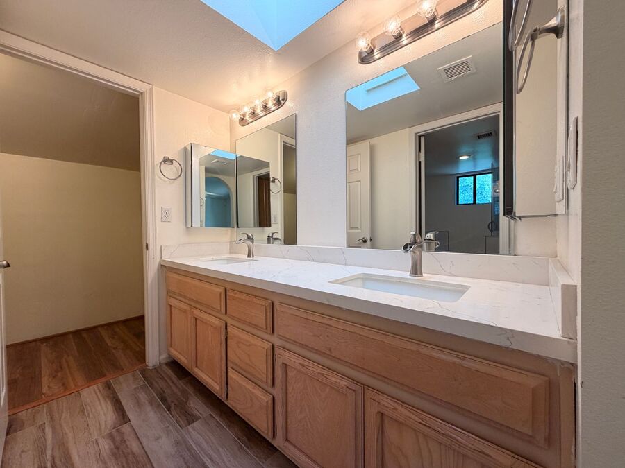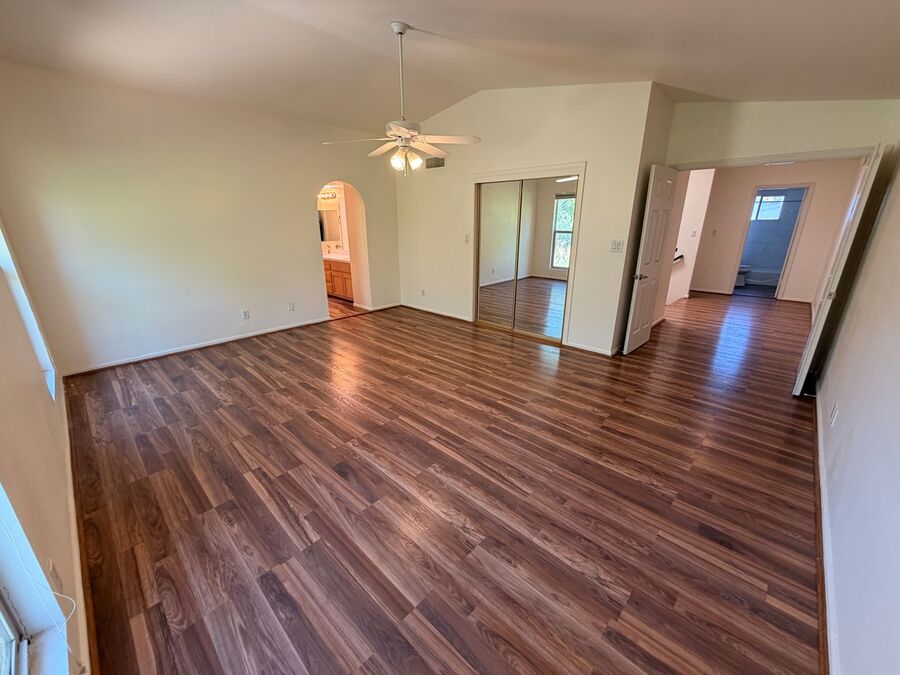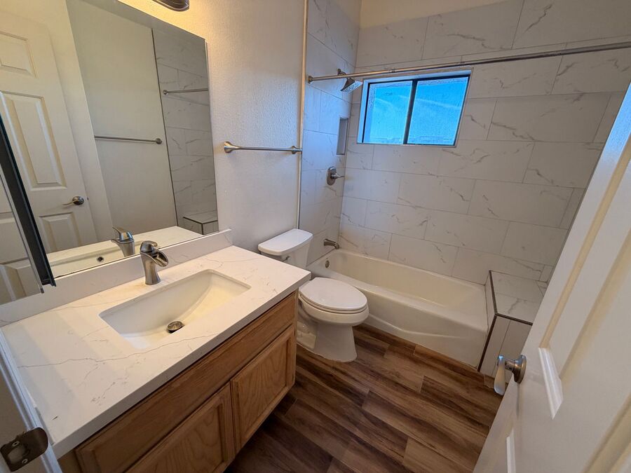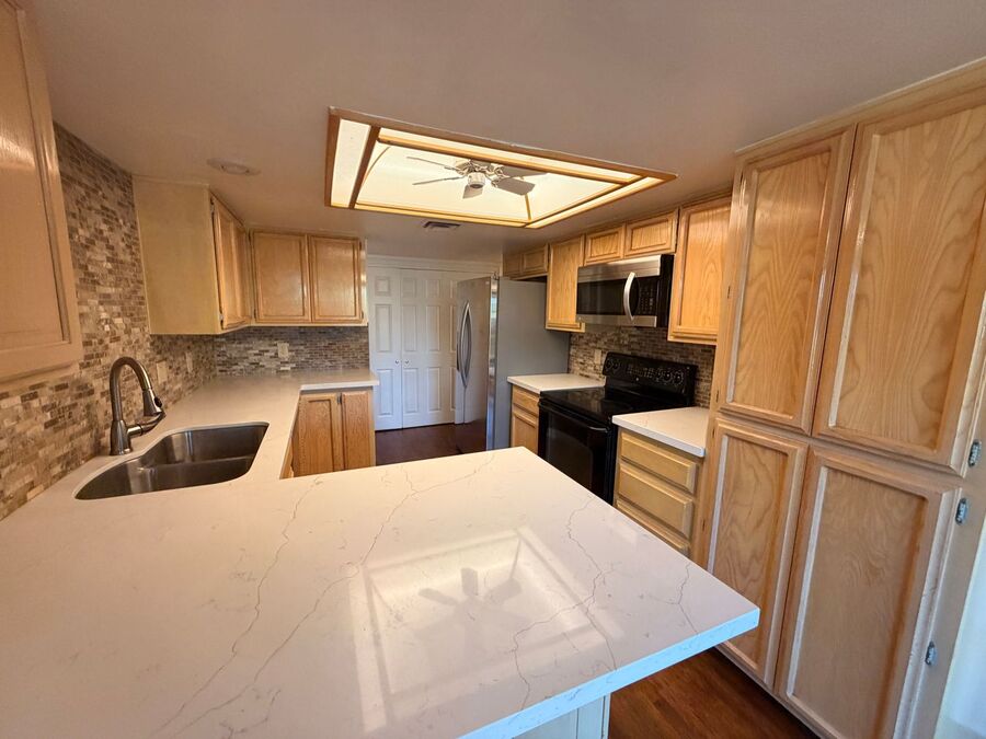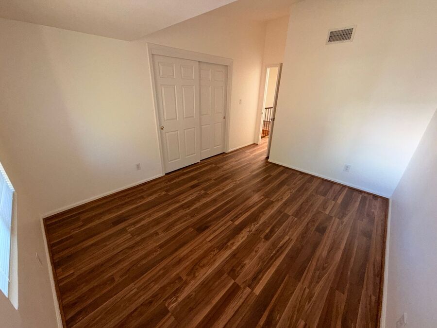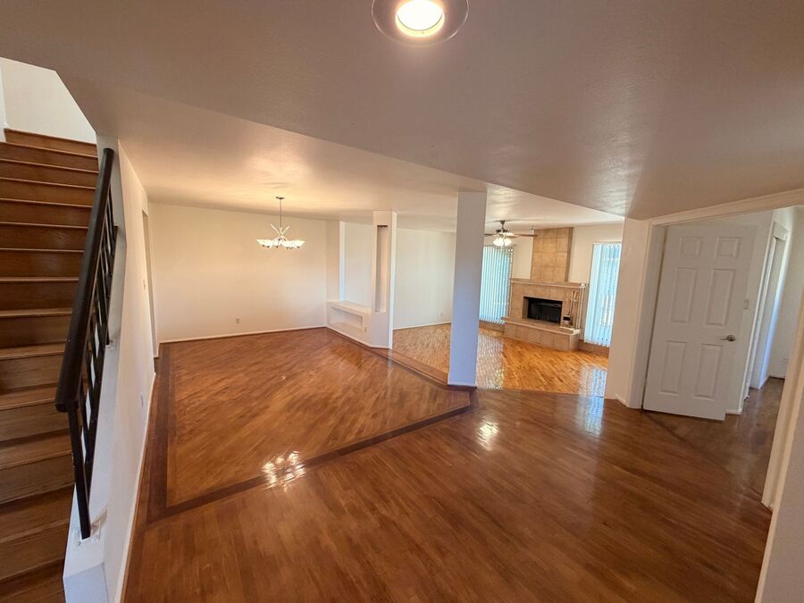 This stunning 3 Bedroom, 3 Bathroom two-story home is available now. The main level is built for both entertaining and relaxation, featuring a formal dining room that opens into a dedicated den with a beautiful stone-faced fireplace. The fully equipped kitchen is a chef’s delight, complete with quality appliances, elegant Corian countertops, an undermounted sink, and an attached breakfast nook framed by picturesque bay windows. A convenient full bedroom and bathroom are also located on the main floor. Upstairs, you will find the spacious master suite, accessed through double-door entry, which offers two large walk-in closets and a luxurious upgraded bath featuring dual sinks, premium countertops, an upgraded tiled/glass enclosed shower, and a separate soaking tub. The two additional guest bedrooms share a tastefully upgraded guest bathroom with a tiled shower. Home features solar panels to reduce monthly electrical costs. Friendly to maximum of 2 spayed/neutered pets with an additional $550 fee per pet.