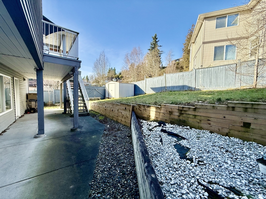 Large sundeck facing a peaceful backyard — ideal for relaxing, barbecues, and outdoor family time.