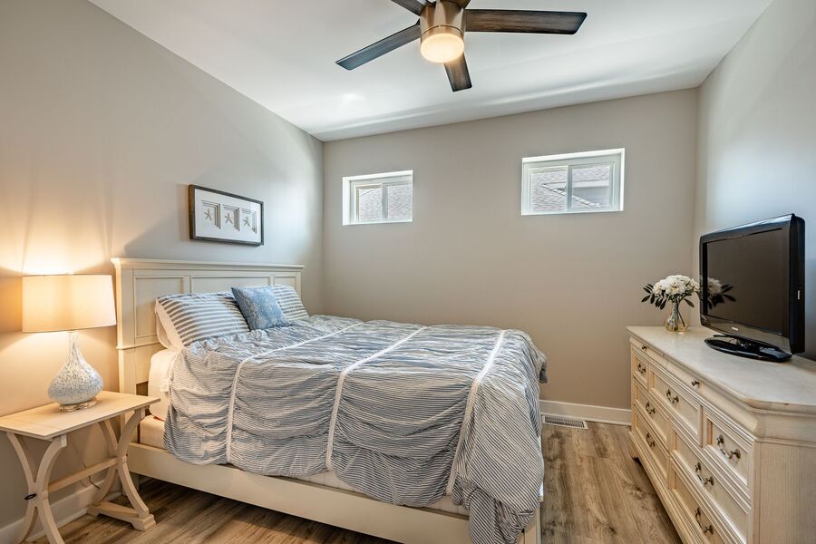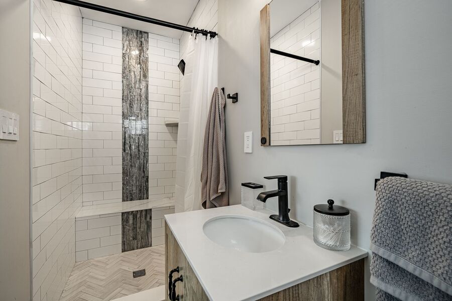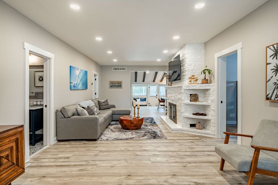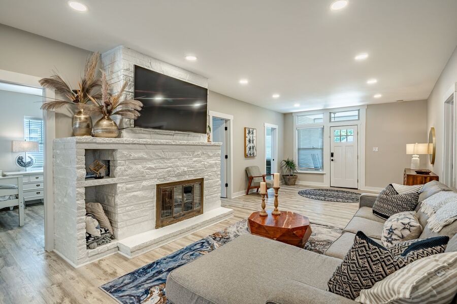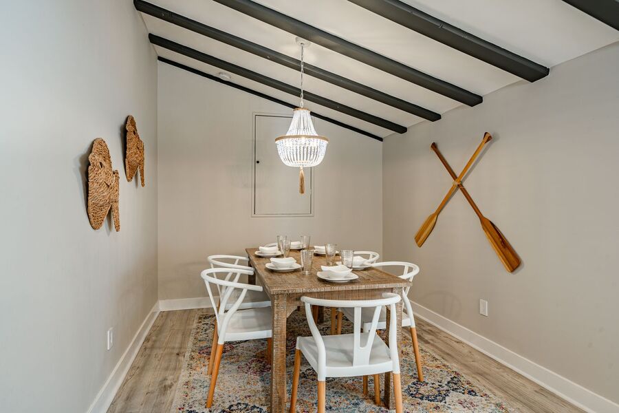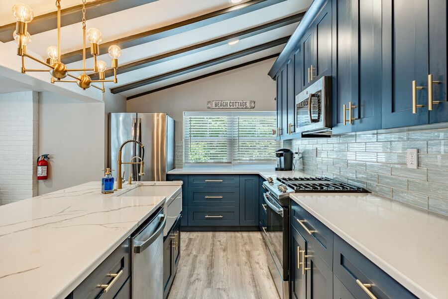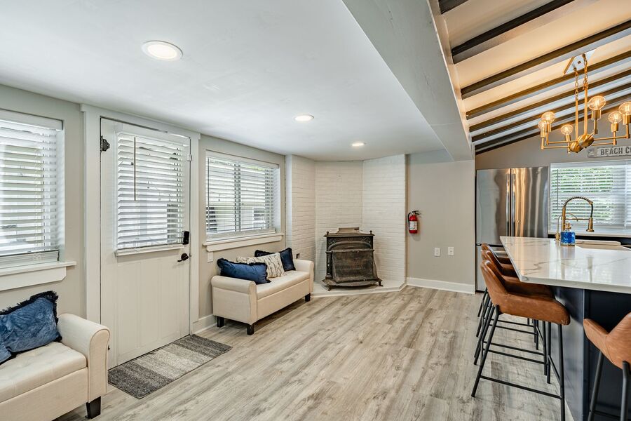 Spacious and beautifully updated, this fully furnished four-bedroom, two-bathroom off-season rental at 5708 Park Blvd in Wildwood, NJ is the largest unit in the triplex and serves as the owner’s suite. Designed for comfort and style, this home features an open-concept layout with a bright and airy living area, modern finishes, and coastal-inspired décor throughout. The renovated kitchen offers sleek navy cabinetry, stainless steel appliances, and a large island with seating—perfect for cooking or entertaining.