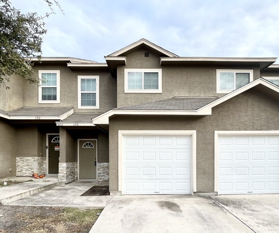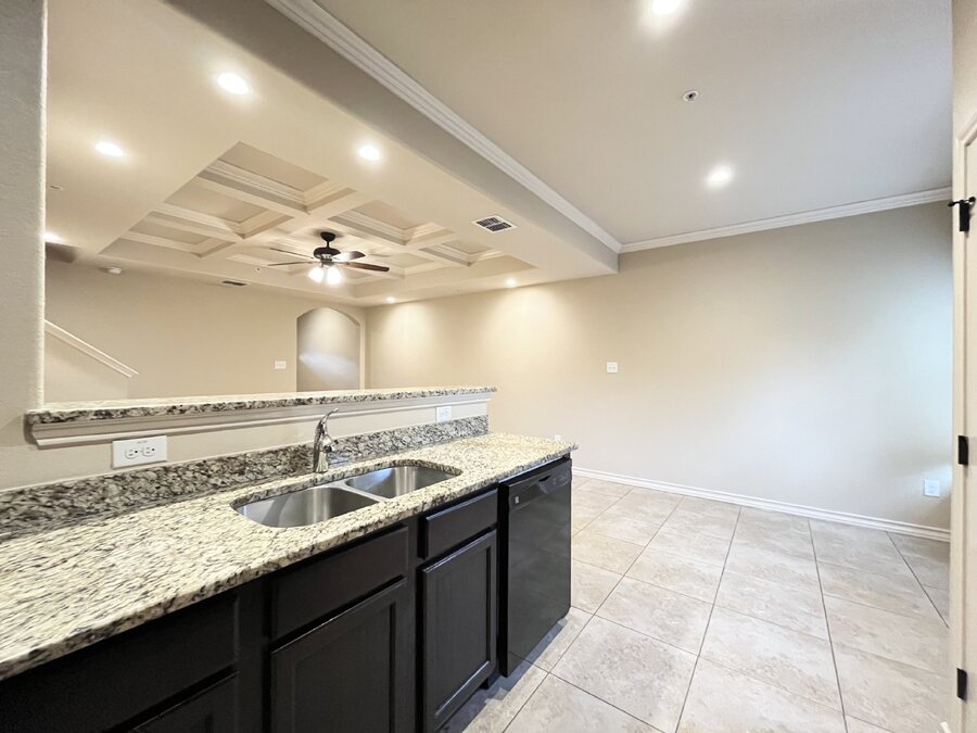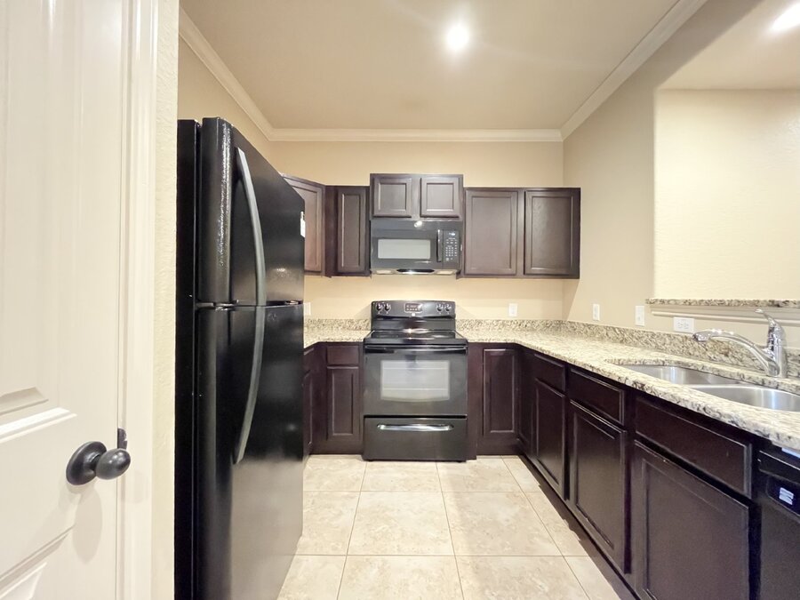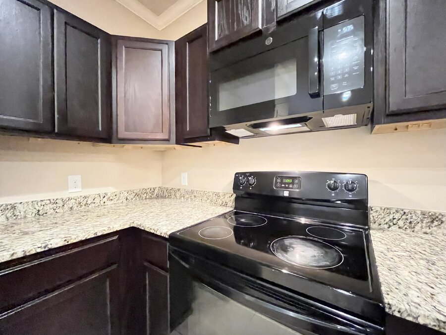 The kitchen is equipped with an electric stove/range, microwave, refrigerator, and dishwasher, providing everything you need for meal preparation. A convenient pantry offers additional storage, while solid countertops enhance both the style and functionality of the space. The adjacent laundry room, located in the garage, includes washer and dryer hookups, adding convenience to daily chores.