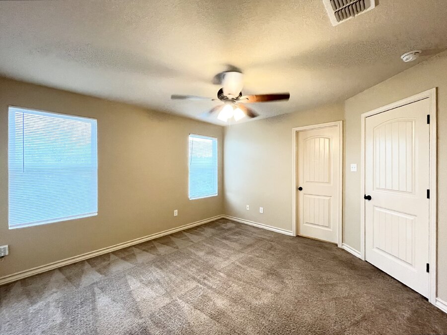 The primary bedroom is a private retreat with a generous walk-in closet and a well-appointed en-suite bath for added comfort. Two additional bedrooms share a second full bath, all designed with thoughtful details and ample closet space. Ceiling fans, double-pane windows, and air conditioning ensure year-round comfort, while a programmable thermostat and electric heat offer easy climate control.