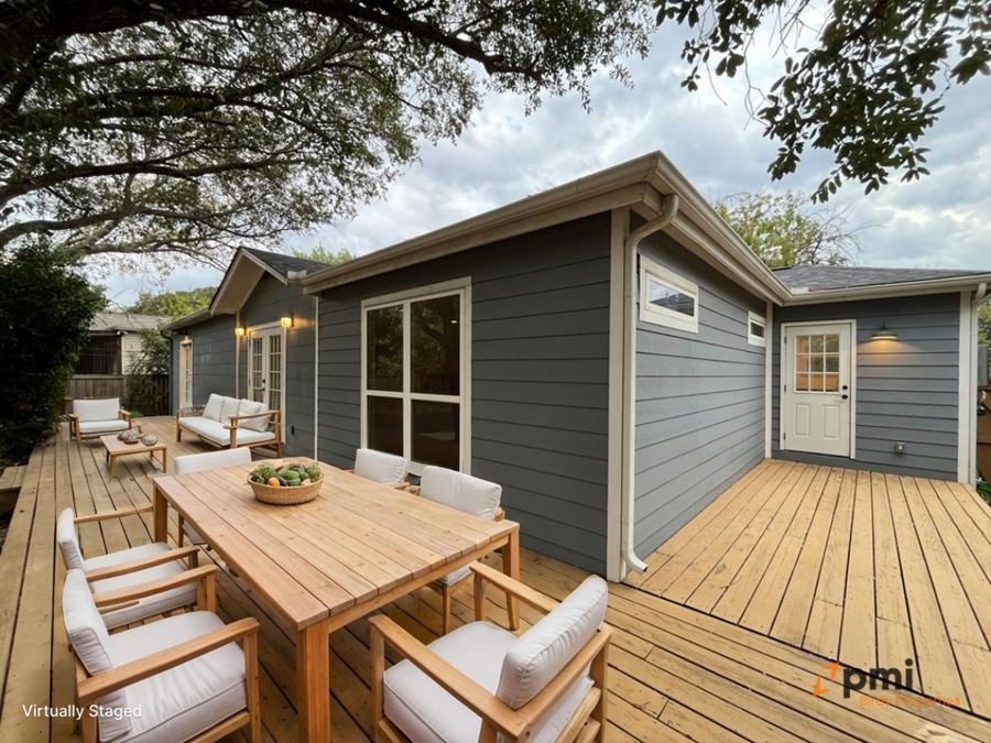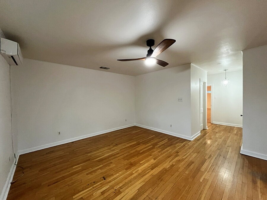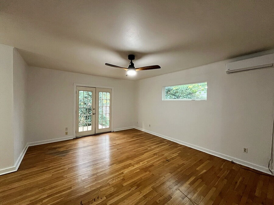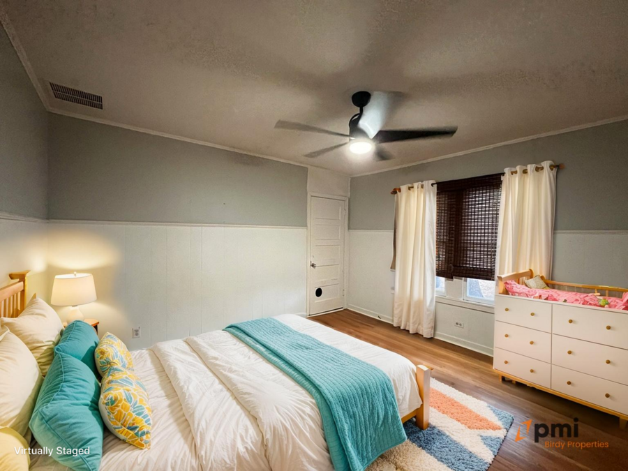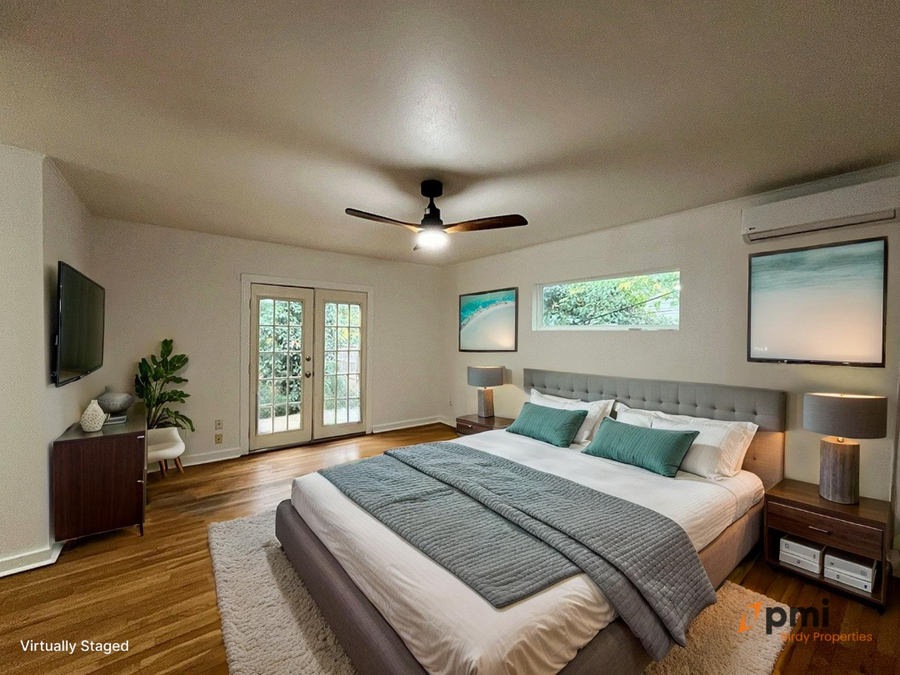 The primary bedroom is a comfortable haven with its own mini split for personalized comfort, private outdoor access, a walk-in closet, and an ensuite bath complete with a walk-in shower and single vanity.