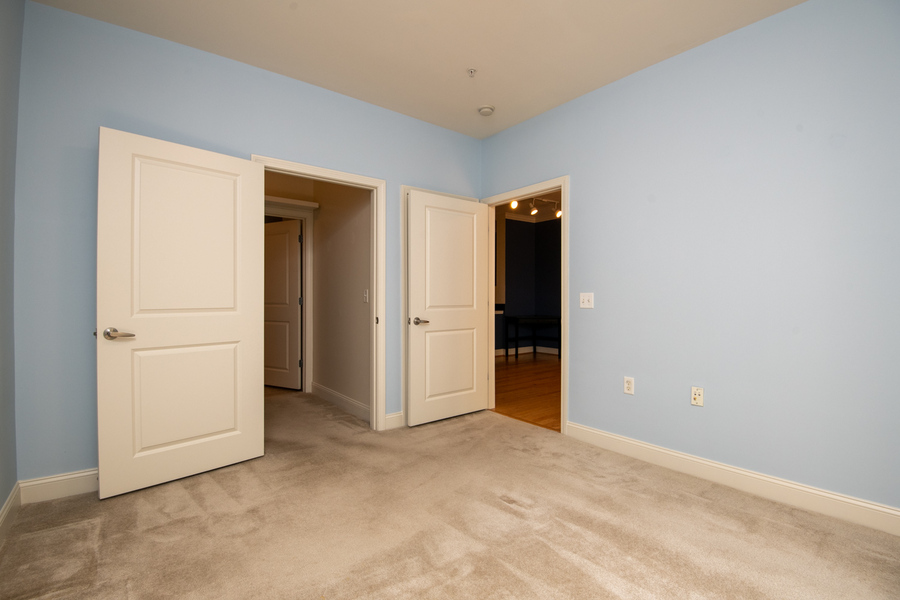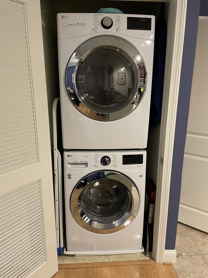 The bedroom offers generous storage with designer California Closet systems, including a walk-in closet. In total, the condo includes four closets providing substantial storage and hanging space. The bathroom is notably large and well laid out. A brand new LG washer and dryer are located in the unit for added convenience.