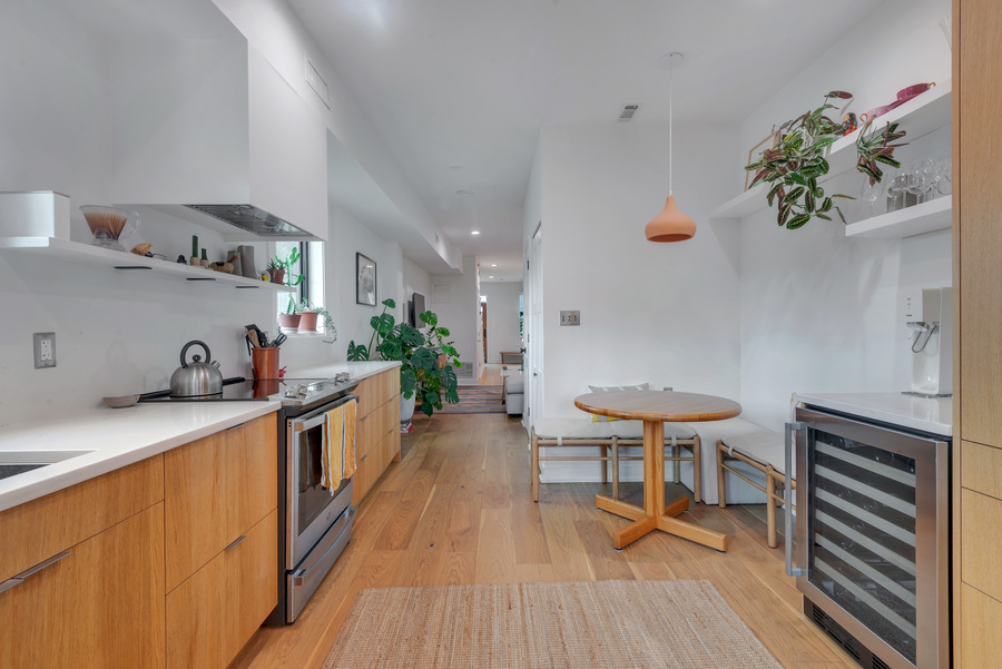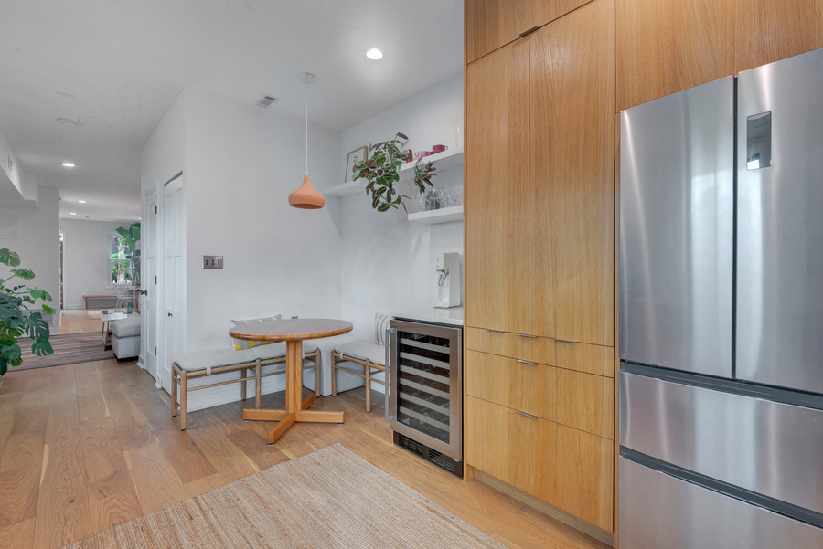 The centerpiece of the home is the brand-new custom eat-in kitchen, designed with modern white oak cabinetry, sleek countertops, and high-end appliances. Perfect for both cooking and entertaining. Upstairs, you will find a newly remodeled main bathroom with thoughtful custom touches, creating a spa-like retreat. The spacious bedrooms and open floor plan provide both comfort and functionality, while the end-unit location ensures extra privacy and quiet.