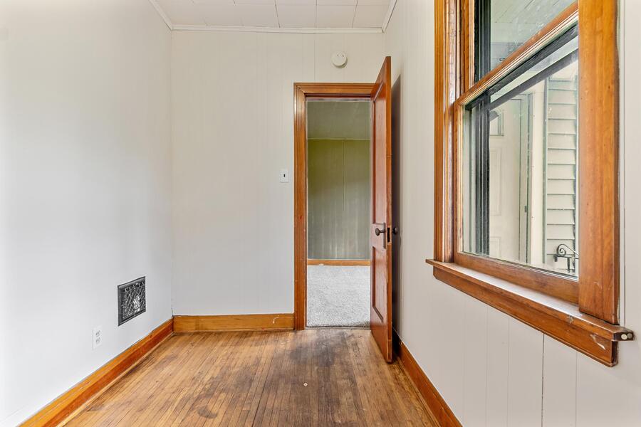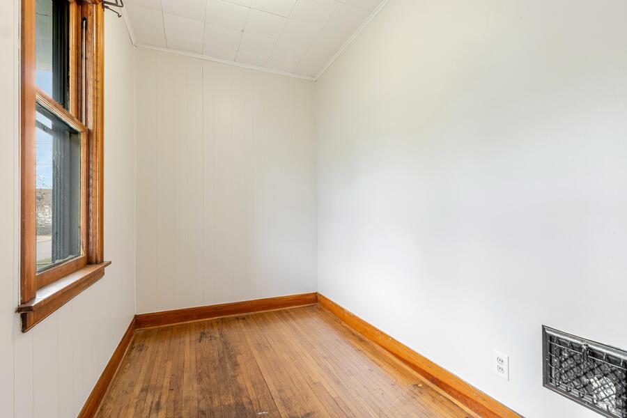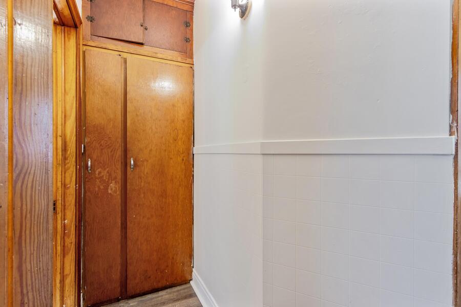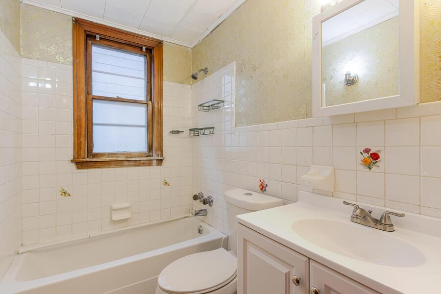 The bathroom features white tile backsplash throughout and into a spacious shower/tub combo. Along with an updated vanity giving the space a fresh modern feel, also has a large window for ventilation.