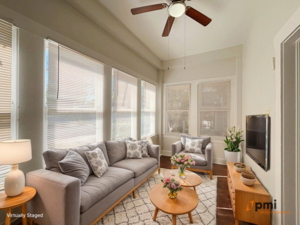 The ceiling fan adds a touch of comfort, while large windows bring in natural light and views of the mature trees surrounding the community.