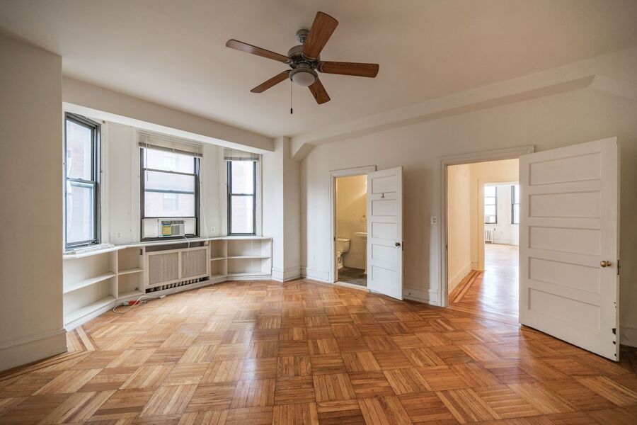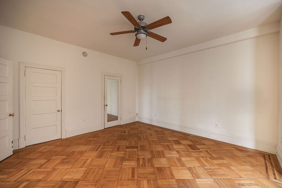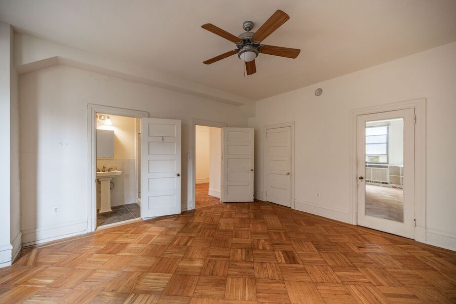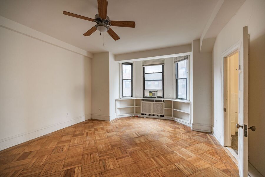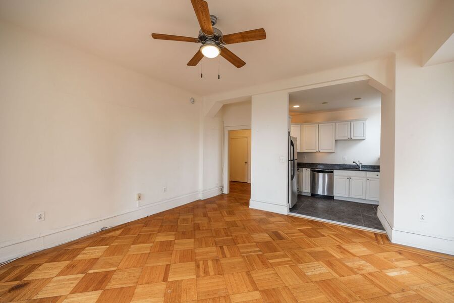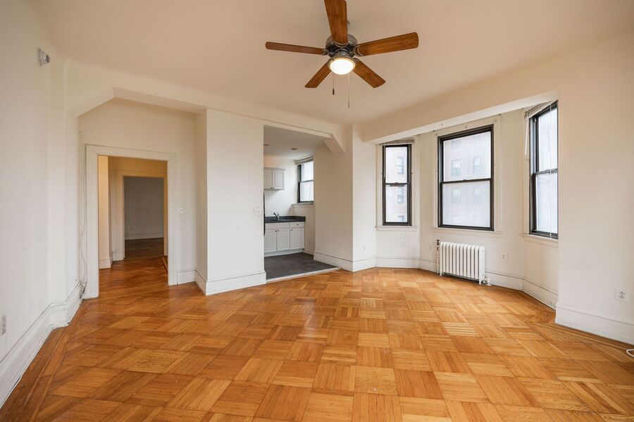 Don't miss this 1 bed 1 bath apartment located in The Lenox Condos building in Washington Square West! This unit features a large open concept living space with original hardwood floors throughout, a ceiling fan, and tons of natural light via the many front facing windows. The adjacent kitchen comes equipped with plenty of cabinet storage and stainless steel appliances such as a dishwasher, electric stove, and microwave. Heading towards the bedroom you will find a large space perfect for unwinding. It features a window ac unit, built-in wall storage, a ceiling fan, two closets, and an en-suite bathroom!
