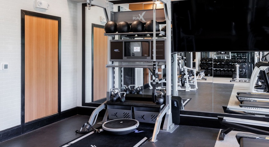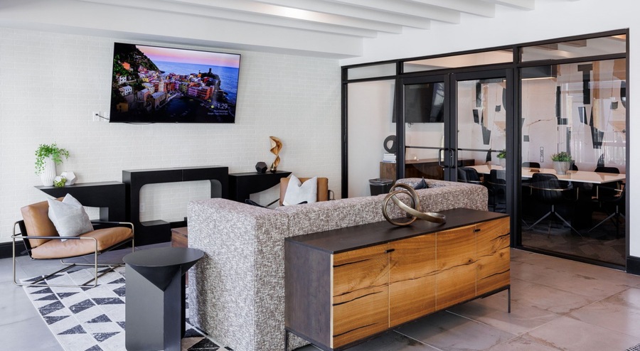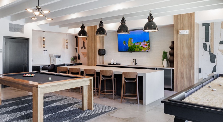 Clubroom with TVs, kitchen, coffee bar, and billiards