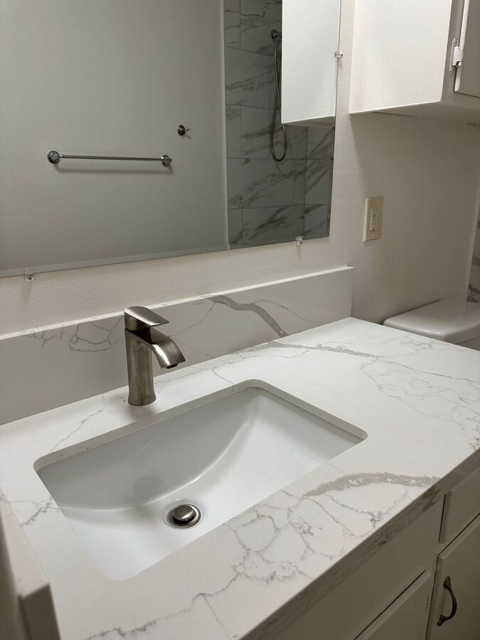 • Fully Remodeled Bathroom with Custom Tile Tub, New Vanity, and Quartz Countertop