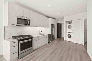The apartments feature pebble oak flooring, quartz countertops, stainless steel appliances, gas range, grey matte cabinets, Moen matte black fixtures, tall ceilings, large windows, and in-unit front-load washer and dryer.