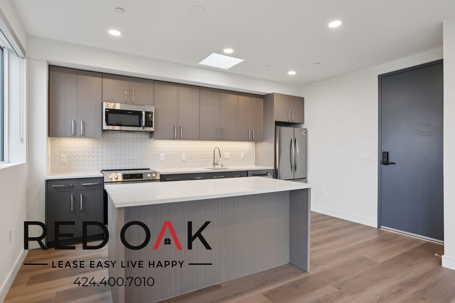 ~ Modern Kitchen: Hardwood cabinets, quartz counters, breakfast island, and stainless steel appliances.