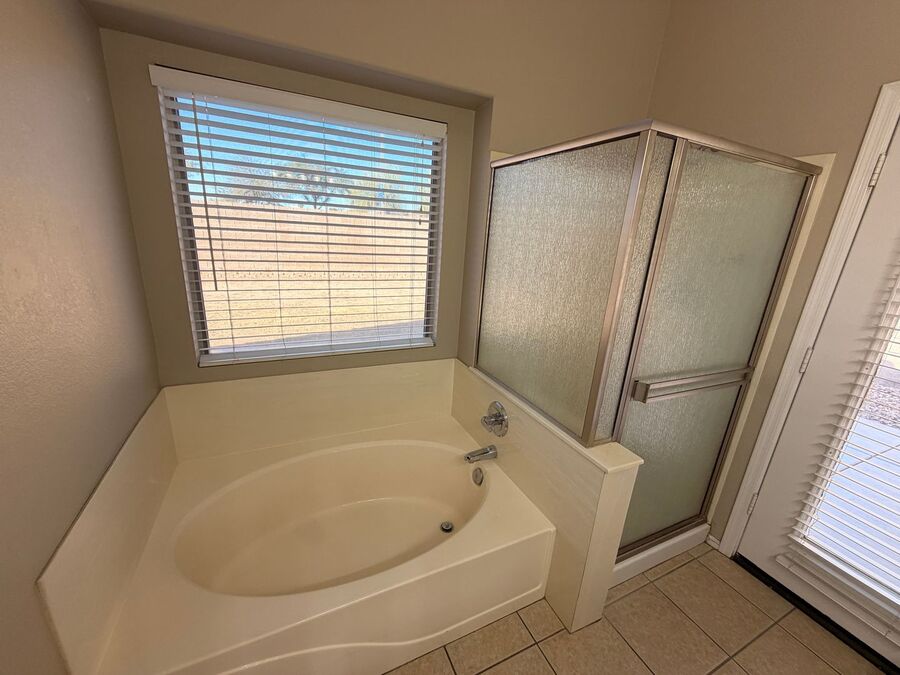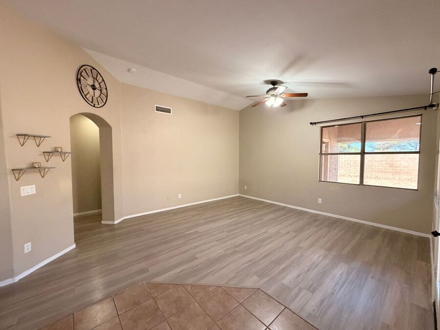 Spacious 3 bed, 2 bath single-family home located in the desirable Kingswood community in Surprise! Custom taupe paint throughout with luxury vinyl wood-look flooring. Bright and airy formal living room with vaulted ceilings and abundant natural light. Modern kitchen featuring gray cabinetry, granite countertops, center island, pantry, and all stainless-steel appliances. Spacious primary suite includes a large walk-in closet and private bath with dual vanities, soaking tub, and separate shower. Two additional bedrooms share a full hallway bathroom. Ceiling fans in every room, updated light fixtures, laundry room with hookups and a 2 car garage completes the home. Enjoy a covered patio with extended paved area, rollup shade and low-maintenance landscaping in both the front and backyard—perfect for easy living and relaxing outdoors. Great location near parks, shopping, school, dining, and major roadways. The home is friendly to maximum 1 spayed / neutered pet with additional $350 per pet deposit.