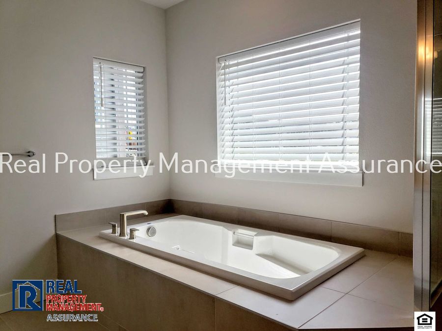 The kitchen includes stainless steel appliances, a stylish backsplash, generous cabinet storage, and a large quartz island perfect for cooking and gathering. The primary suite offers two walk-in closets and a spa-like bath with soaking tub, walk-in shower, and double vanity. Two additional bedrooms are generously sized.