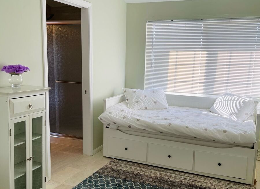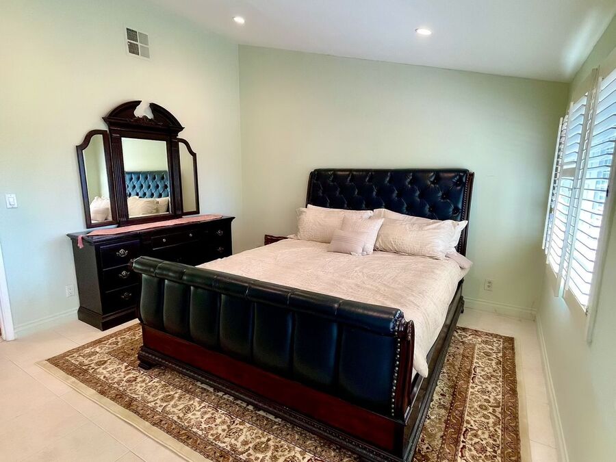 The bedrooms are designed for comfort and versatility. Key features include plantation shutters, large mirrored closet doors that amplify the space, and recessed lighting. One of the standout bedrooms features elegant French doors that open directly onto the back patio, allowing you to wake up to spectacular views and immediate outdoor access. The bathrooms are well-maintained, featuring classic tile work, ample vanity space, and charming vintage-inspired fixtures.