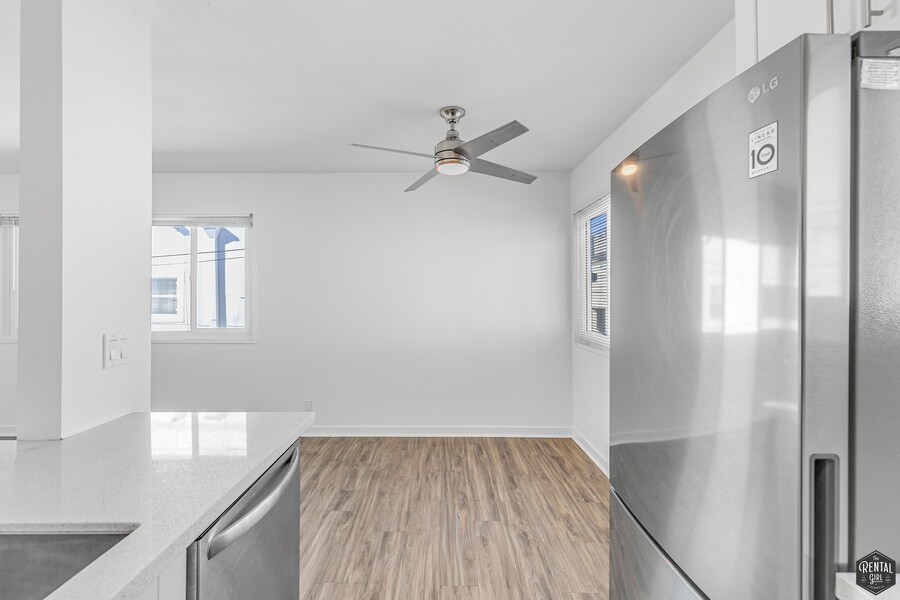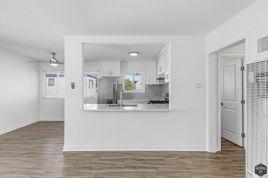 Sunlight pours into the spacious living area, creating an airy, open vibe that’s perfect for morning coffee, afternoon lounging, or hosting friends who will absolutely comment on how good your place feels. The updated kitchen features stainless steel appliances and clean, modern finishes that make cooking feel way more appealing than it should.