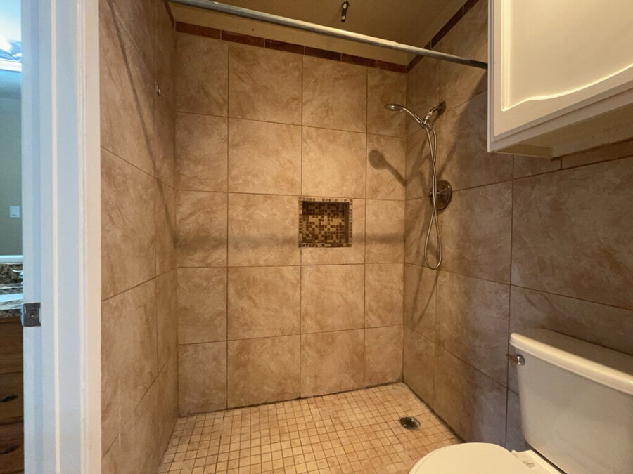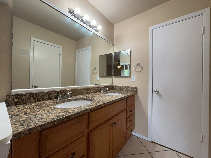 The spacious primary bedroom offers a relaxing retreat with direct outdoor access to the backyard, along with a walk-in closet and a private ensuite bath complete with a double vanity and walk-in shower. A convenient half bath connects to the primary bath, adding extra accessibility and functionality.