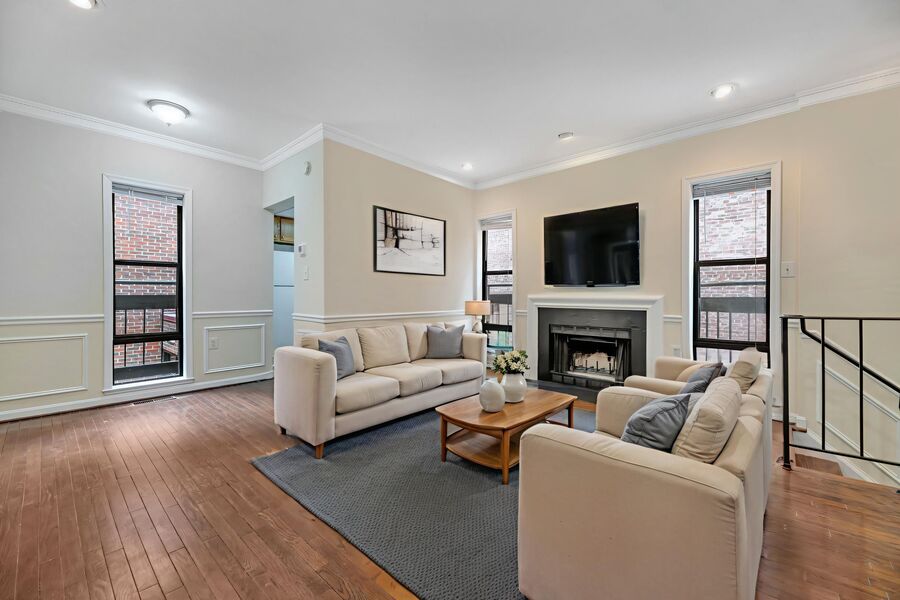 Beautiful two-story apartment with hardwood floors and beaming natural light throughout! The living area features a cozy fireplace and is open to the small dining area and efficient kitchen with newer all-white appliances. Upstairs leads you to a bright full bathroom, and a stacked washer and dryer down the hall. The spacious bedroom is situated at the end of the hall and features a beautiful wrap-around fireplace, ample closet space, and allows excellent natural light with full-length windows.
