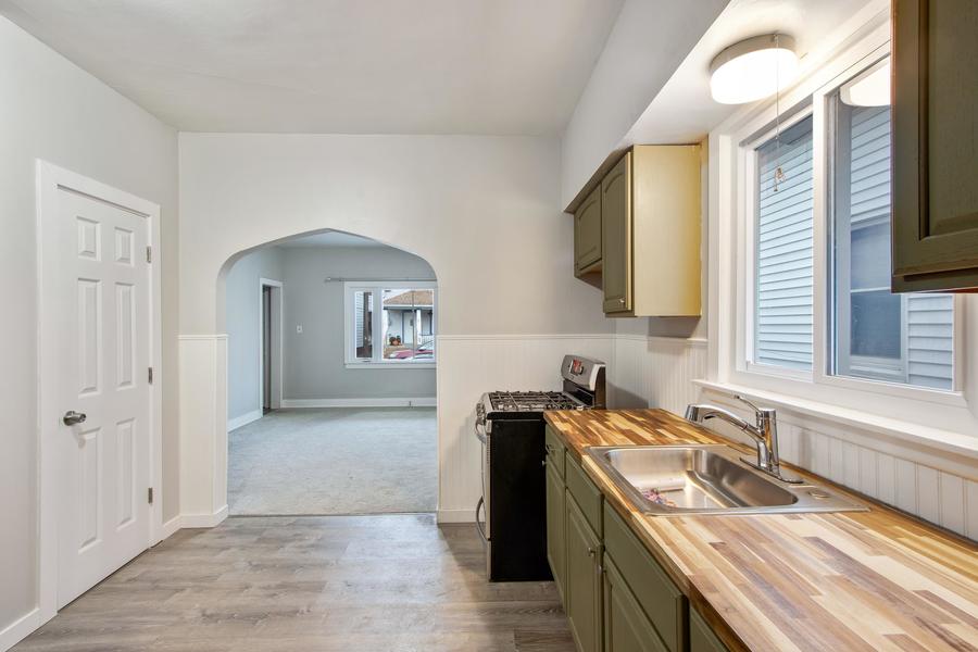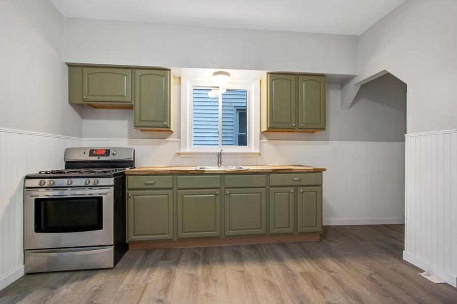 The kitchen stands out with trendy green cabinets, attractive butcher block countertops, and modern appliances, creating a vibrant and functional space.