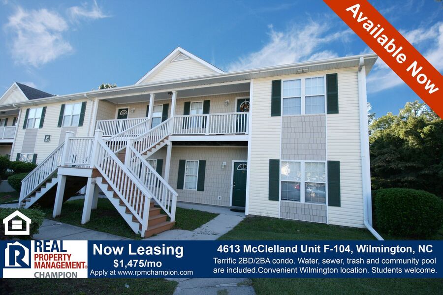 This ground level 2 BD / 2 BA Condo features a covered back patio and easy access to the community pool. The floor plan offers an open main living area with split bedrooms for maximum privacy. The kitchen has ample cabinets, floor to ceiling pantry, double sink and breakfast bar. A refrigerator, range, built-in microwave and dishwasher are included. The living and dining areas feature a decorative half wall and column to define the space, as well as a sliding glass door for lots of natural light. The master bedroom includes a private bath with step-in shower and a walk-in closet. The second bedroom is just steps away from a full bath which has a combination tub/shower. A utility closet comes complete with stacking washer and dryer for your convenience. Water, sewer, trash and access to the community pool are included with the rent. Centrally located and close to shopping, dining, UNCW, area beaches, and all that Wilmington has to offer. Students welcome. Hurry! This won’t last long!
