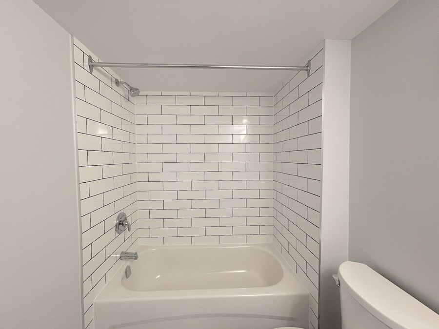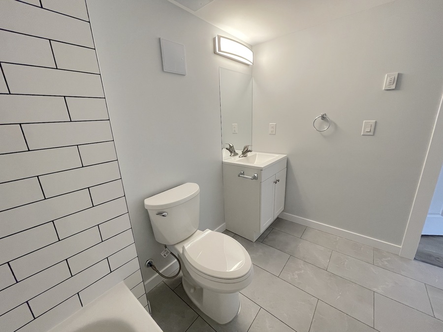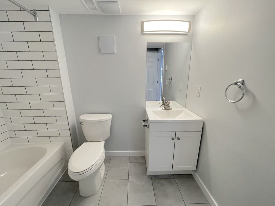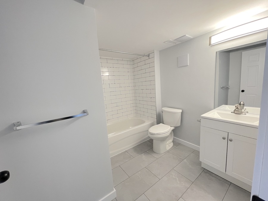 Spacious three-piece bathroom, featuring storage in the vanity, and a tub/shower combo.