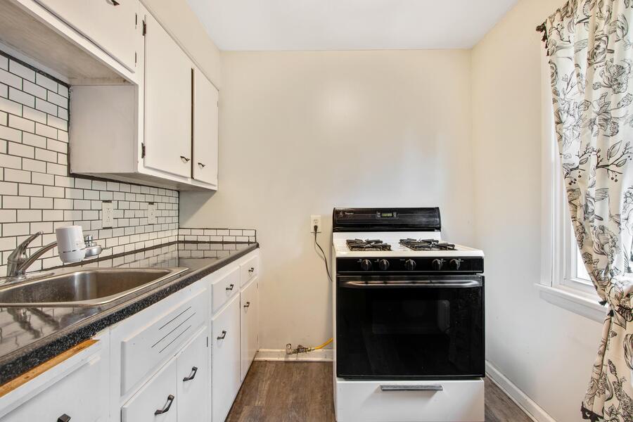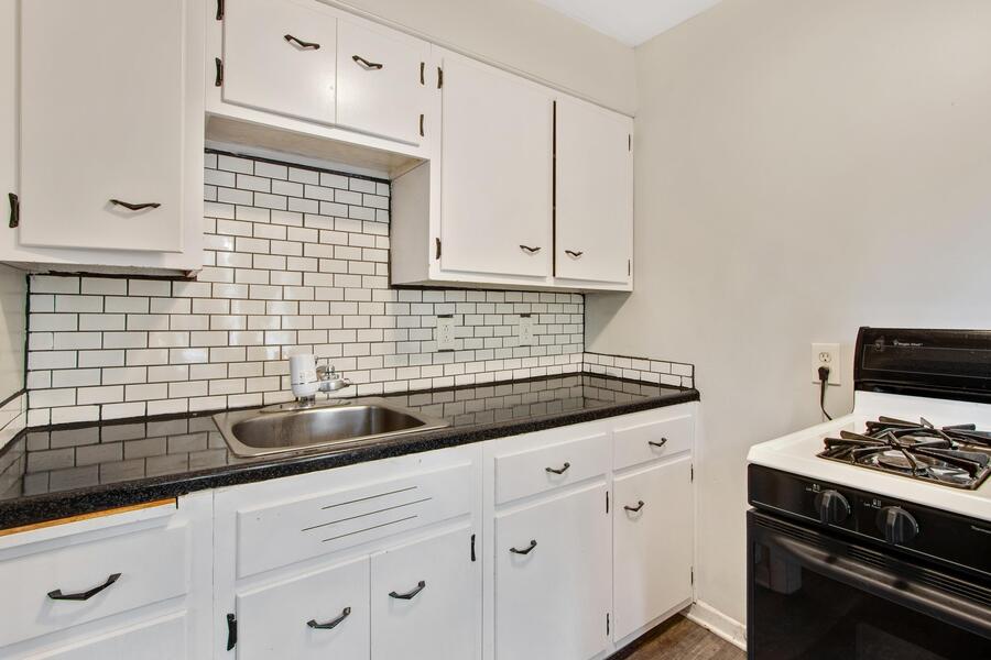 The kitchen features crisp white cabinetry with dark countertops, a stylish white tile backsplash, and overhead cabinet storage for added functionality. A refrigerator and stove are included, providing everything you need to start cooking right away.