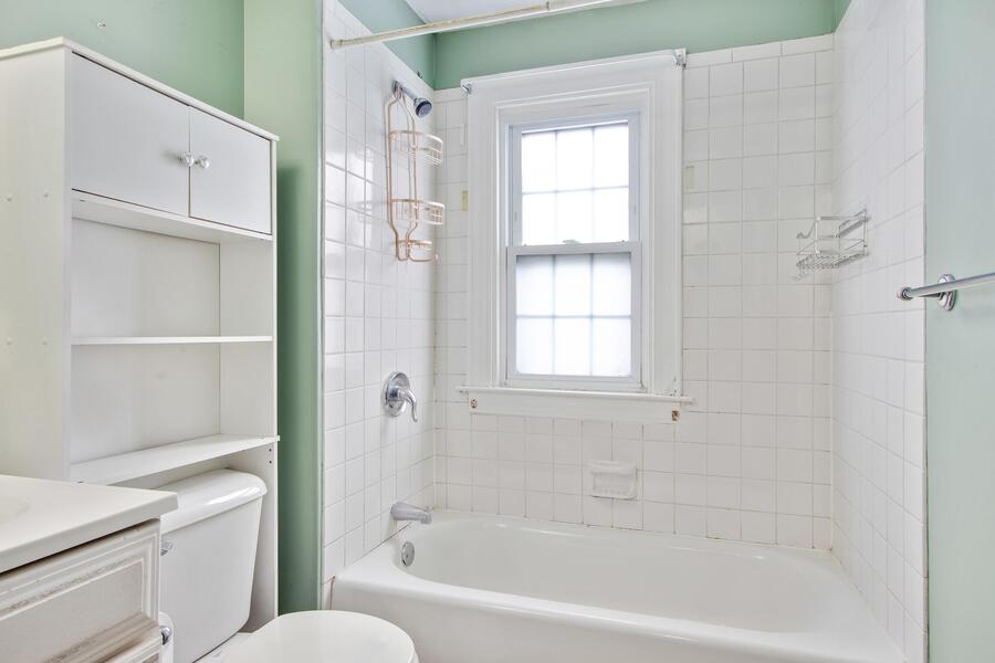 In the bathroom, you’ll find a clean white vanity, a tile-surround tub and shower, and built-in shelving above the toilet for convenient storage.