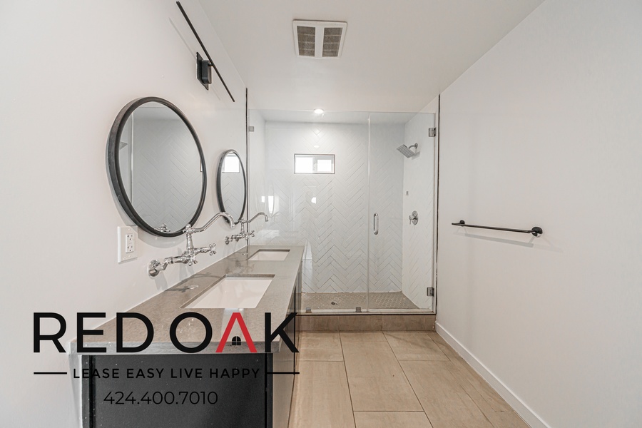 ~ Elegant Bath: Modern fixtures, walk-in shower, and ample vanity storage.