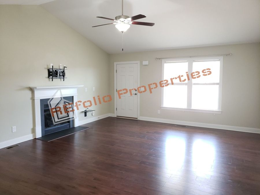 Features an open floorplan with wood-look flooring. The living room offers a gas-logged fireplace and ceiling fan. The kitchen includes stainless steel appliances, double sinks, and plenty of cabinet space, and sits beside the dining room with access to the screened porch and deck overlooking a great flat backyard. All bedrooms feature carpet flooring. The primary suite includes double vanities, a tub, and a walk-in closet.