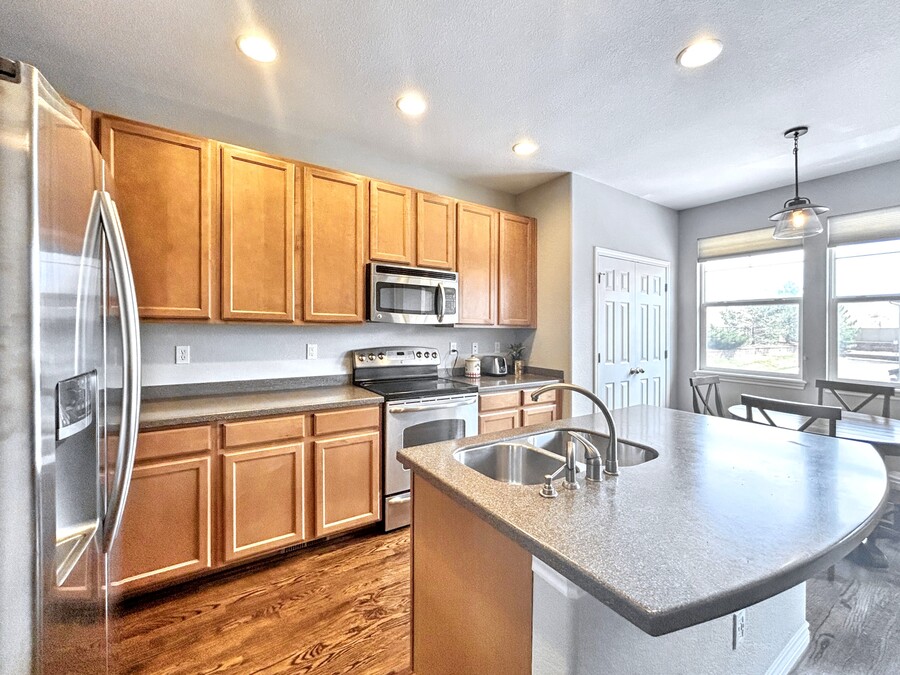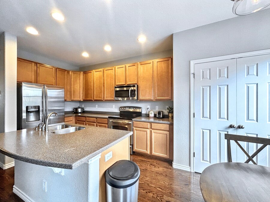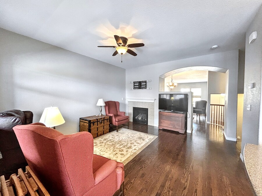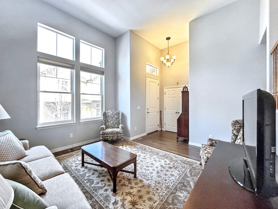 This beautifully maintained home exudes charm and elegance from top to bottom. As you step inside, you’re greeted by an abundance of natural light pouring in through expansive windows, filling the formal living room with warmth and radiance. Upstairs you find a gorgeous kitchen with hardwood cabinets and a huge island with stainless steel appliances. Off the kitchen you'll find a cozy living room with a gas fireplace perfect for those Colorado nights and an included flat screen tv mount!