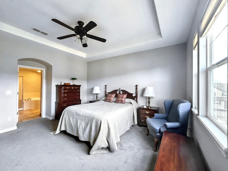 The third level features a gorgeous primary suite with a tray ceiling, ceiling fan, attached five piece bath, and a large walk in closet! The third level also features a large laundry room, 2 additional bedrooms, and another full bath. Storage space is plentiful throughout, and the home comes with an attached two-car garage and driveway parking, ensuring you’ll never be short on space.