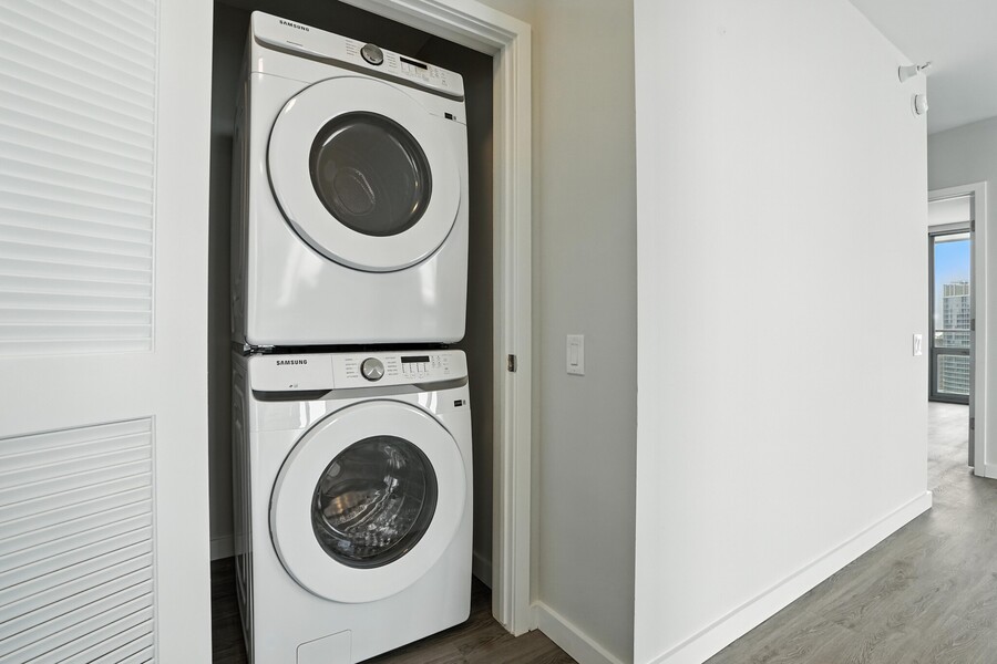 All of these modern, open floor plans make great use of space, accentuated by the floor-to-ceiling windows. Upgraded kitchens include quartz countertops and stainless steel appliances, while bathrooms showcase oversized cultured marble vanities. Expect spacious closets, vinyl plank flooring (Berber carpet in the bedrooms) and resident-controlled heating and air conditioning. Each unit also has its own full-size washer and dryer.
