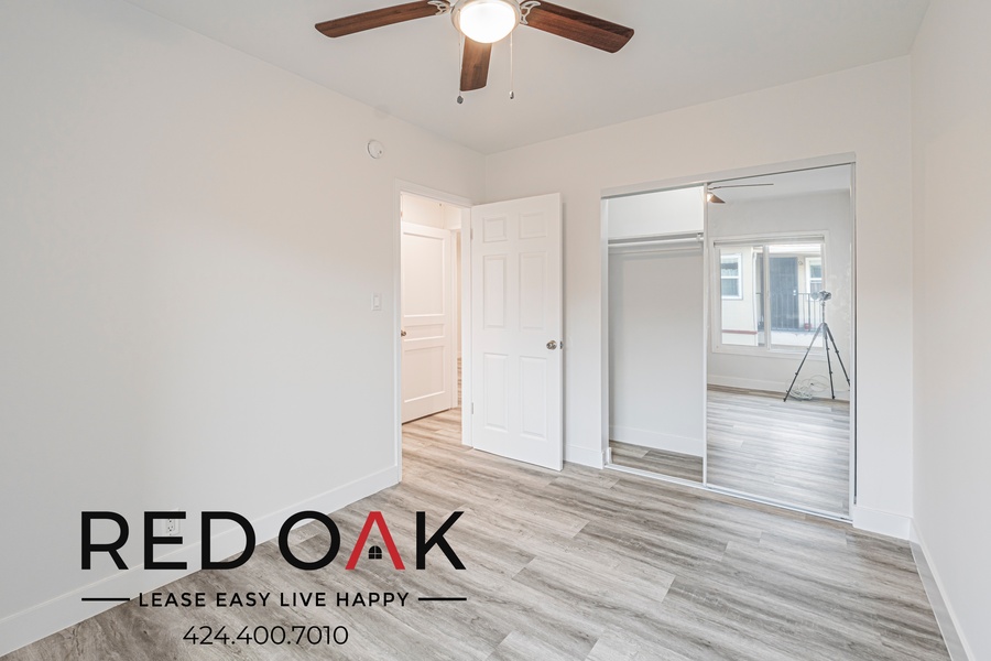 ~ Peaceful Retreat: Spacious bedroom with a mirrored closet and ceiling fan.