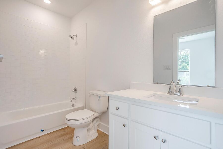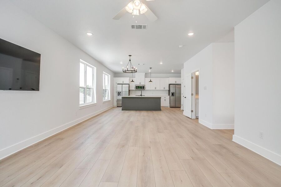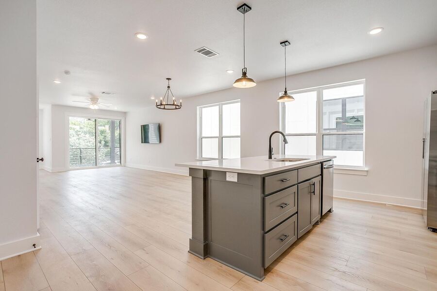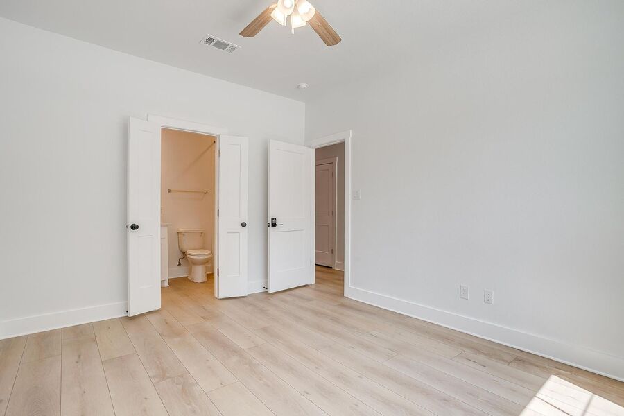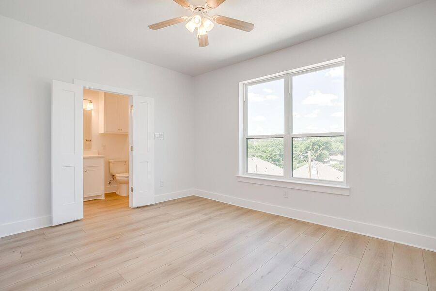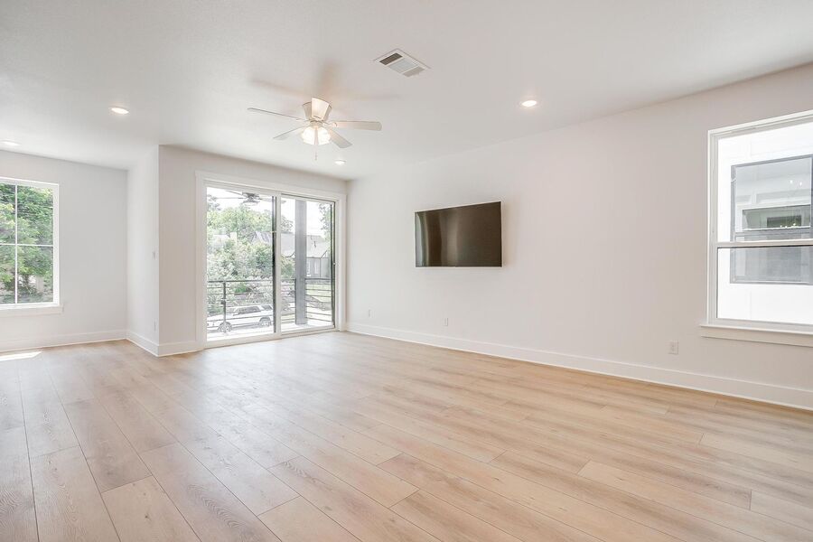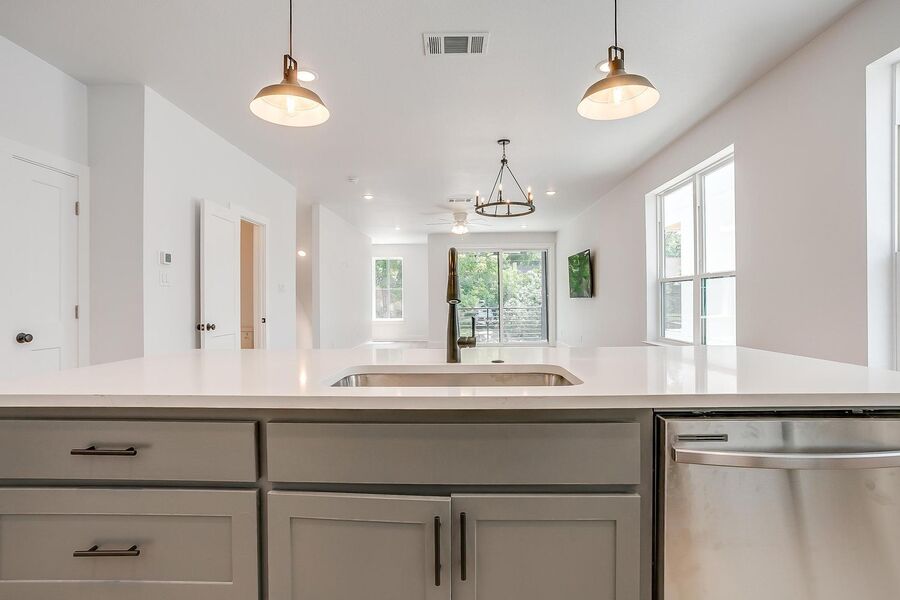 TCU housing at its best. There are 5 generous private bedrooms, each with a private bathroom and private coded door lock. The common floor features solid surface floors, a balcony, large open living area with flat screen TV, powder bath, and a kitchen your parents will envy. There are 2 bedrooms on the 1st floor and 3 on the 3rd floor with a set of washers and dryers on each floor – so no schlepping up and down the stairs to do your laundry. Parking is private, well lit, fenced, off street, and onsite.