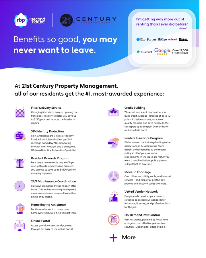 All 21st Century Property Management residents are enrolled in the Resident Benefits Package (RBP) for $50.95/month which includes liability insurance, credit building to help boost the resident's credit score with timely rent payments, up to $1M Identity Theft Protection, HVAC air filter delivery (for applicable properties), move-in concierge service making utility connection and home service setup a breeze during your move-in, our best-in-class resident rewards program and much more! To get the most out of the RBP residents can upgrade into our premium RBP package for ($65.95/month) which includes on-demand pest control. More details upon application.