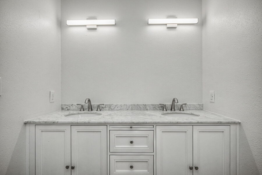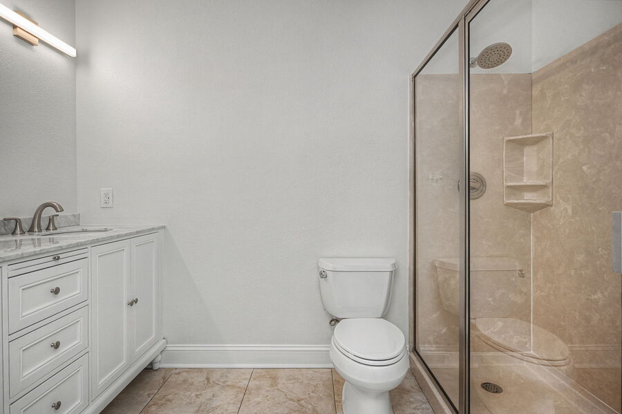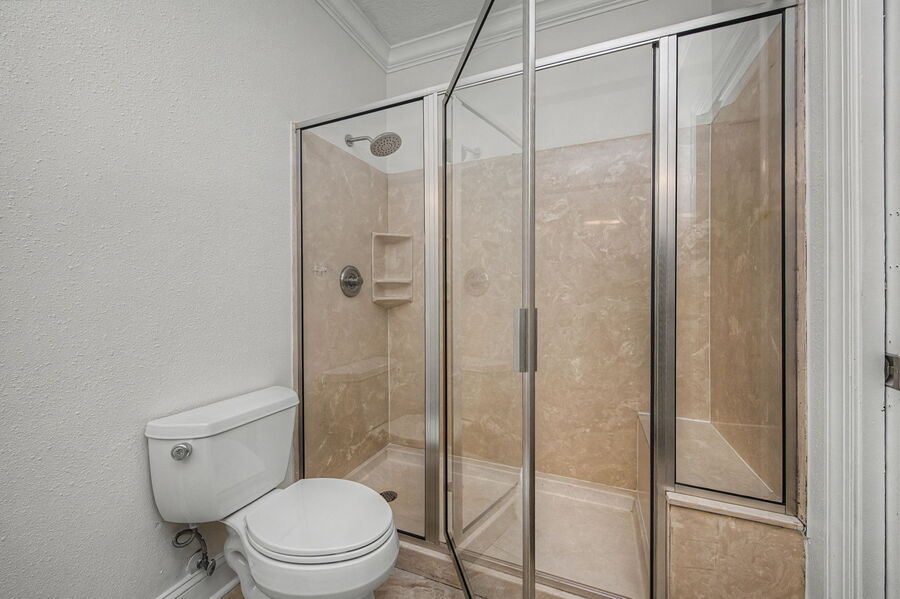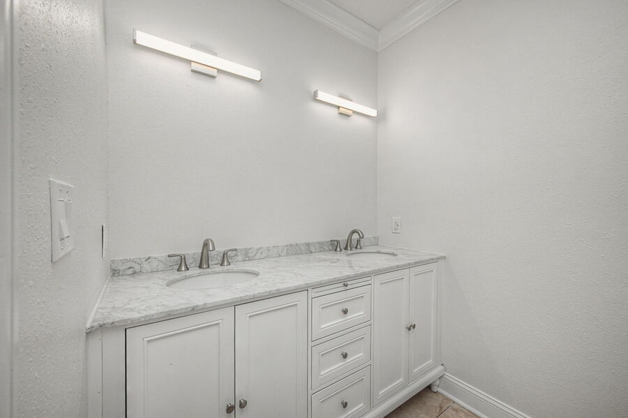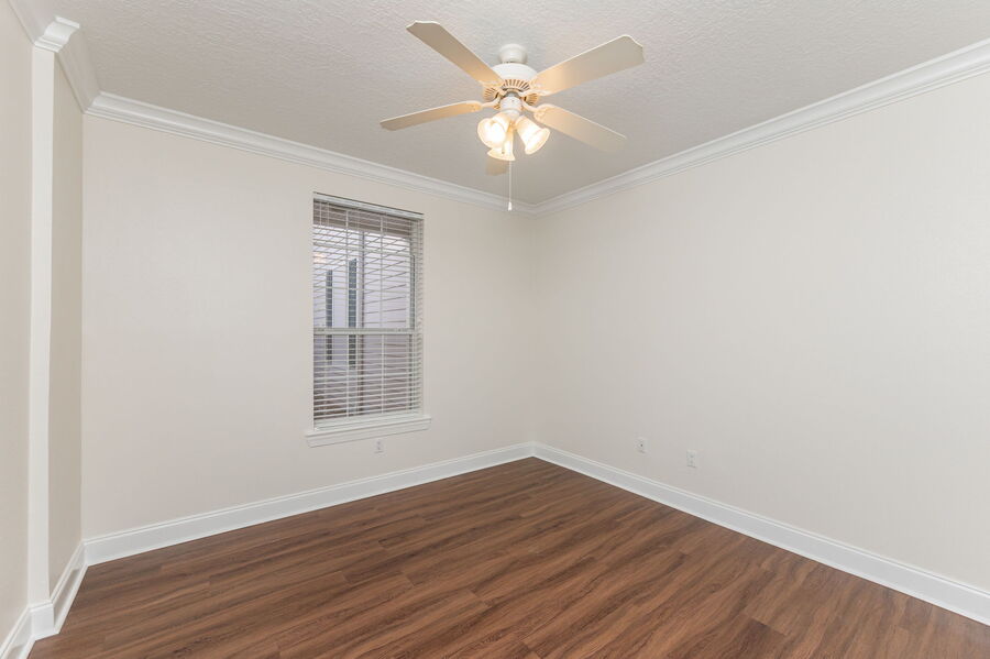 The primary suite features wood-look LVP flooring, crown molding, ceiling fan, double closets, and a beautifully updated en-suite bath complete with a new granite double vanity and walk-in shower.