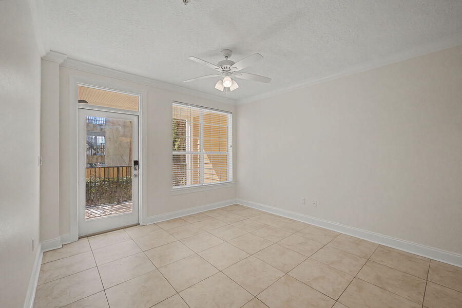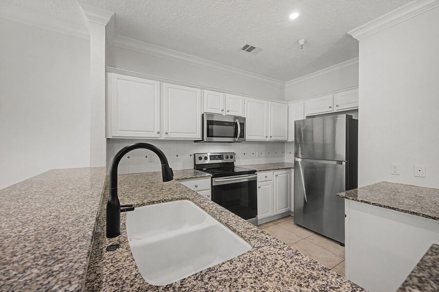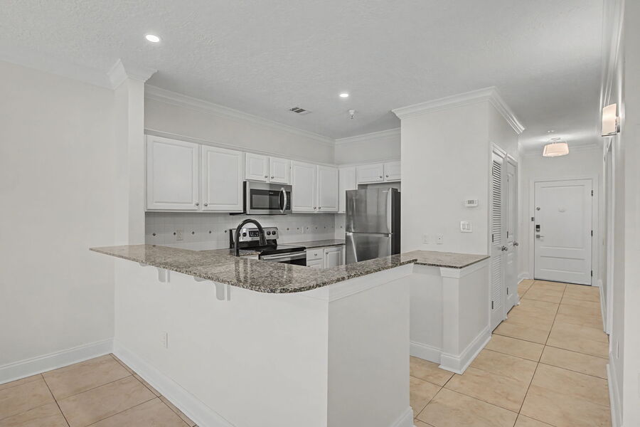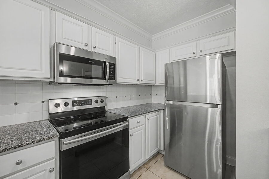 The kitchen is well-appointed with granite countertops, tile backsplash, stainless steel appliances (refrigerator, dishwasher, glass-top stove, and microwave), and a convenient breakfast bar for additional seating and entertaining.