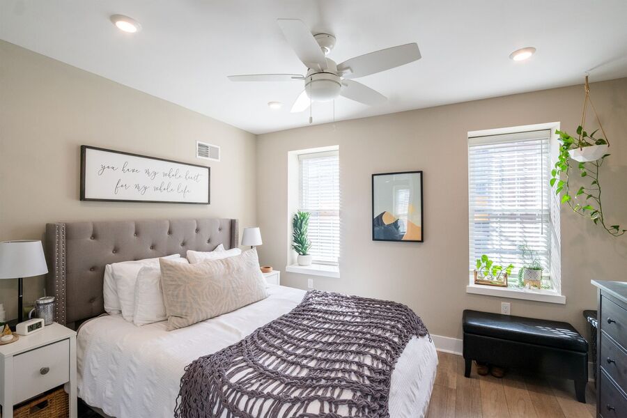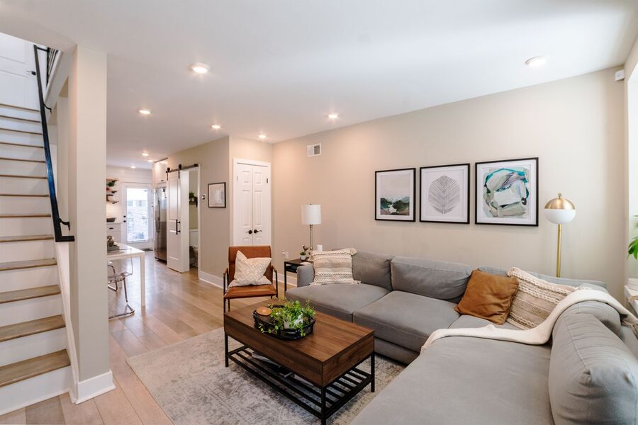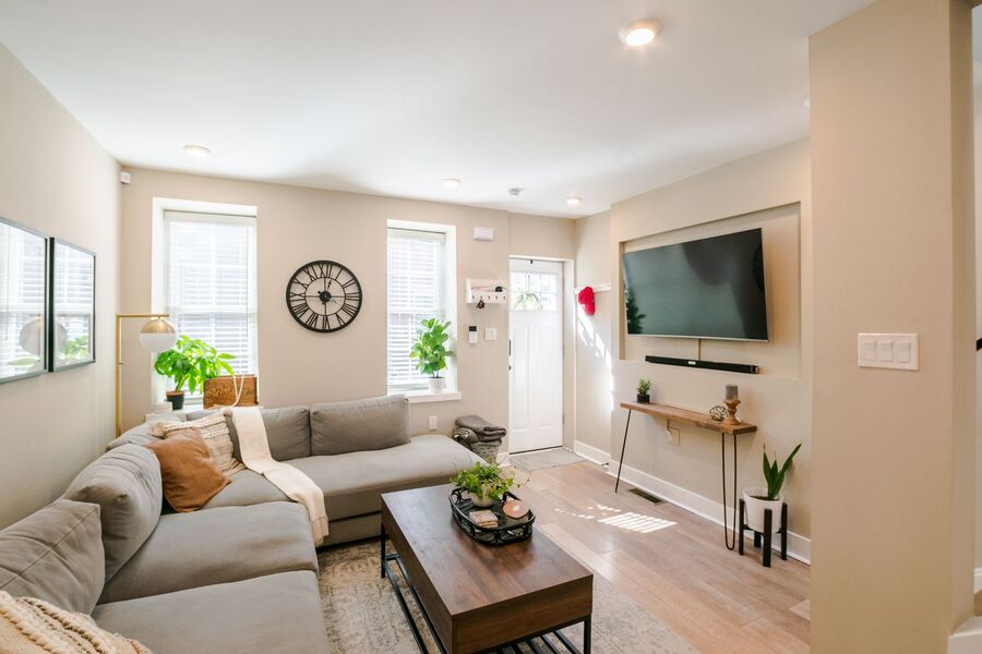 Welcome to 1435 S Bouvier St, a beautiful 2 bed, 1.5 bath townhome in Point Breeze with luxury finishes throughout! Upon entering, step into a welcoming, sunny living room with a coat closet and powder room that has a stylish sliding door. This leads to the gourmet kitchen, fit with stainless steel appliances, a pot filler, shiplap wall paneling, pendant lighting, and rustic floating shelves. Entertaining here is a breeze, as you can enjoy meals al fresco in your large back patio or watch a movie in the fully finished basement that also hosts the laundry tucked away in its own closet. Upstairs, you will find more unique touches including a skylight letting in amazing natural light, as well as the full bath with a contemporary tiled shower, designer lighting and classic vanity. Each bedroom is generously sized with their own closets, and flanks opposite sides of the home for optimal privacy. Beyond the wonderful home, enjoy the perks of being in close proximity to S Broad St, Columbus Square Park, as well as popular local restaurants like American Sardine Bar, Batter and Crumbs Café, and Burrata BYOB!