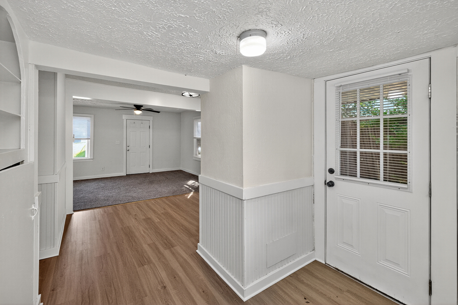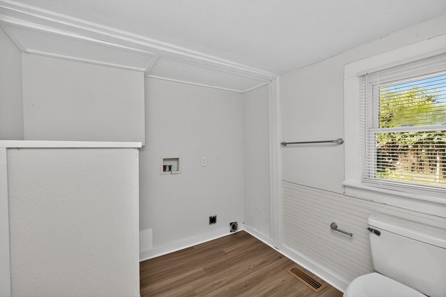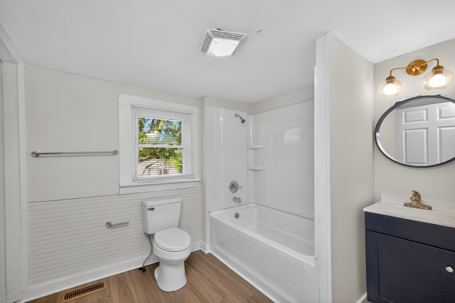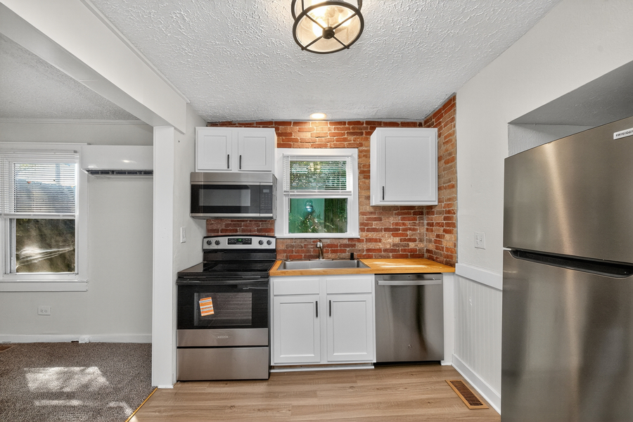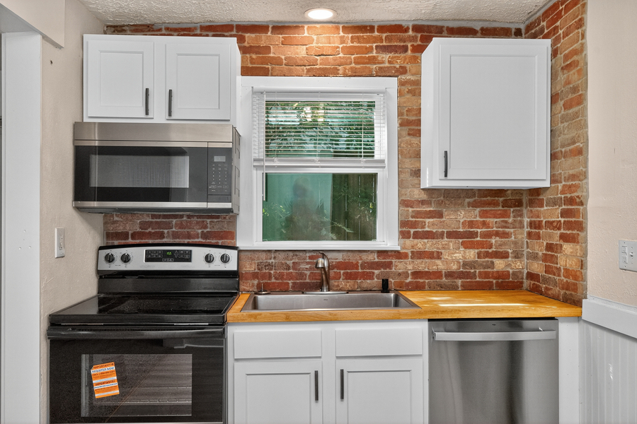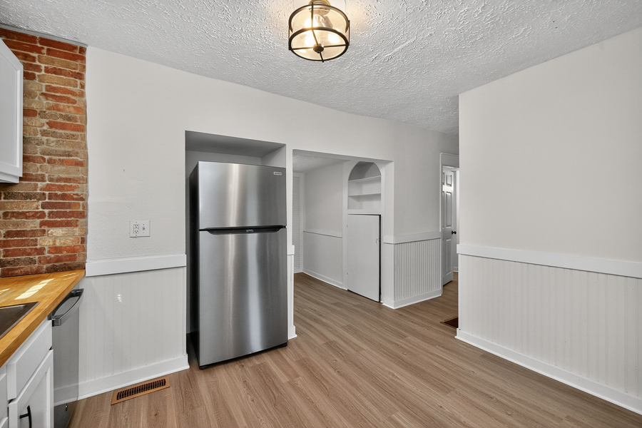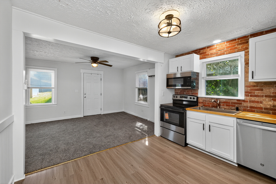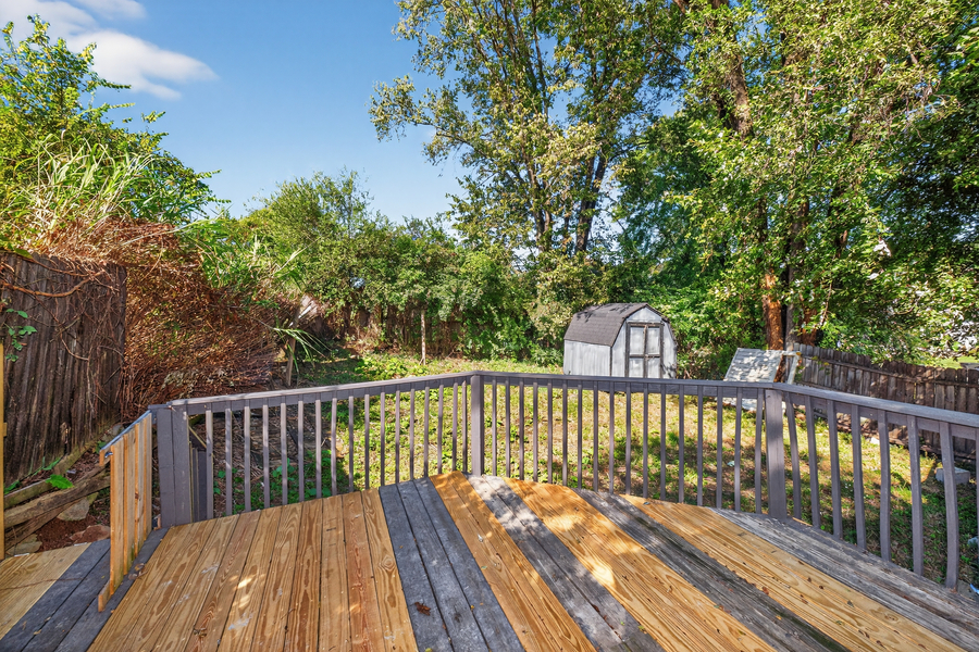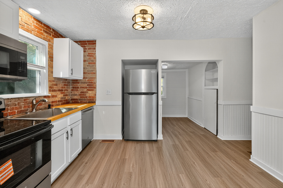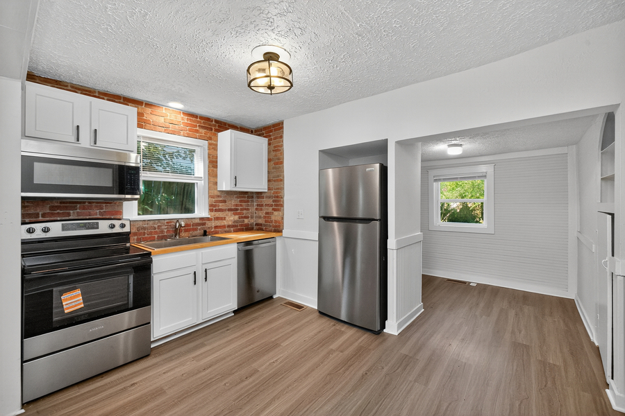 This home has been beautifully remodeled! It features an original exposed brick accent wall, a reading nook or office, and a sizeable backyard with a large deck. Updates include LVT flooring throughout, new appliances in the kitchen, and modern features and vanity in the bathroom.