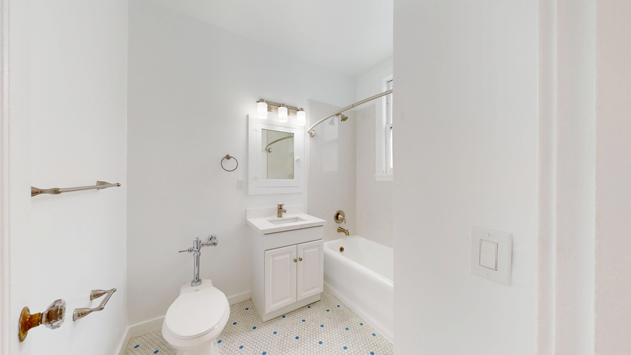 The bathroom has been tastefully renovated for a fresh, clean look.