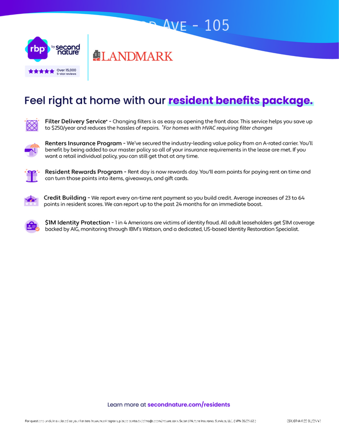 Landmark offers an optional program that handles insurance, identity protection, air filter delivery, credit building, and rent rewards. Residents have the option to personalize some components during onboarding, which may increase or decrease the monthly amount. More details upon application.