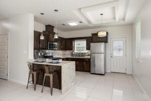 Enjoy beautiful open space interior design, porcelain tile, Granite Countertops, Pendant Lighting in the Kitchen, Espresso Custom Cabinets w/ Brush Nickel Hardware. Ceiling Fan in Living and Bedrooms, Tile Showers