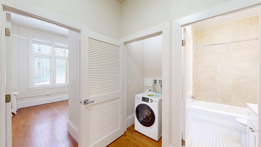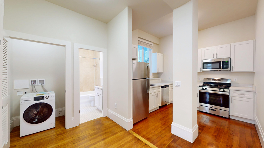 The kitchen provides ample cabinet storage and workspace for everyday cooking, while the convenience of in-unit laundry makes daily living easy and efficient.